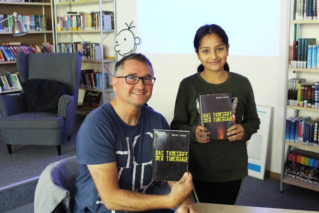 Auf großen Wunsch unseres Kurses hin las Herr Schaaf aus seinem Roman “Das Todesriff der Tigerhaie” und dann stellte uns Clara aus der 7b, die den Kurs unterstützt, ihren Romananfang von “Halldor im Bücherparadies 2” vor- sie arbeitet zur Zeit nämlich mit dem Autoren zusammen, um seinen Halldor-Roman in dem Setting der Schulbibliothek des Goethe-Gymnasiums fortzusetzen.