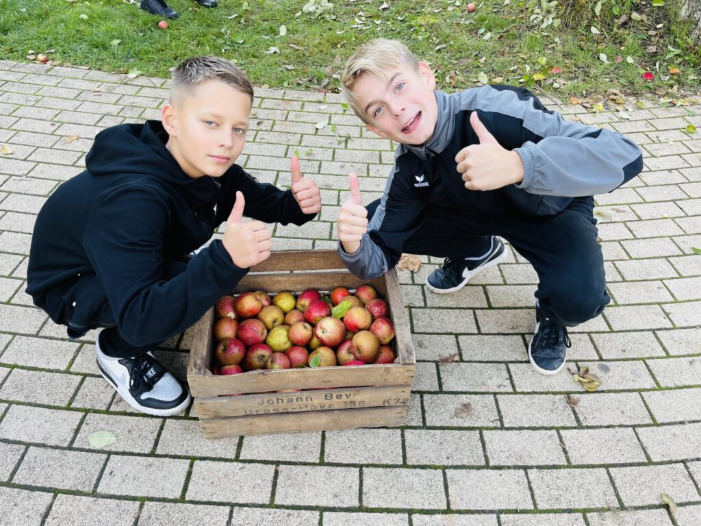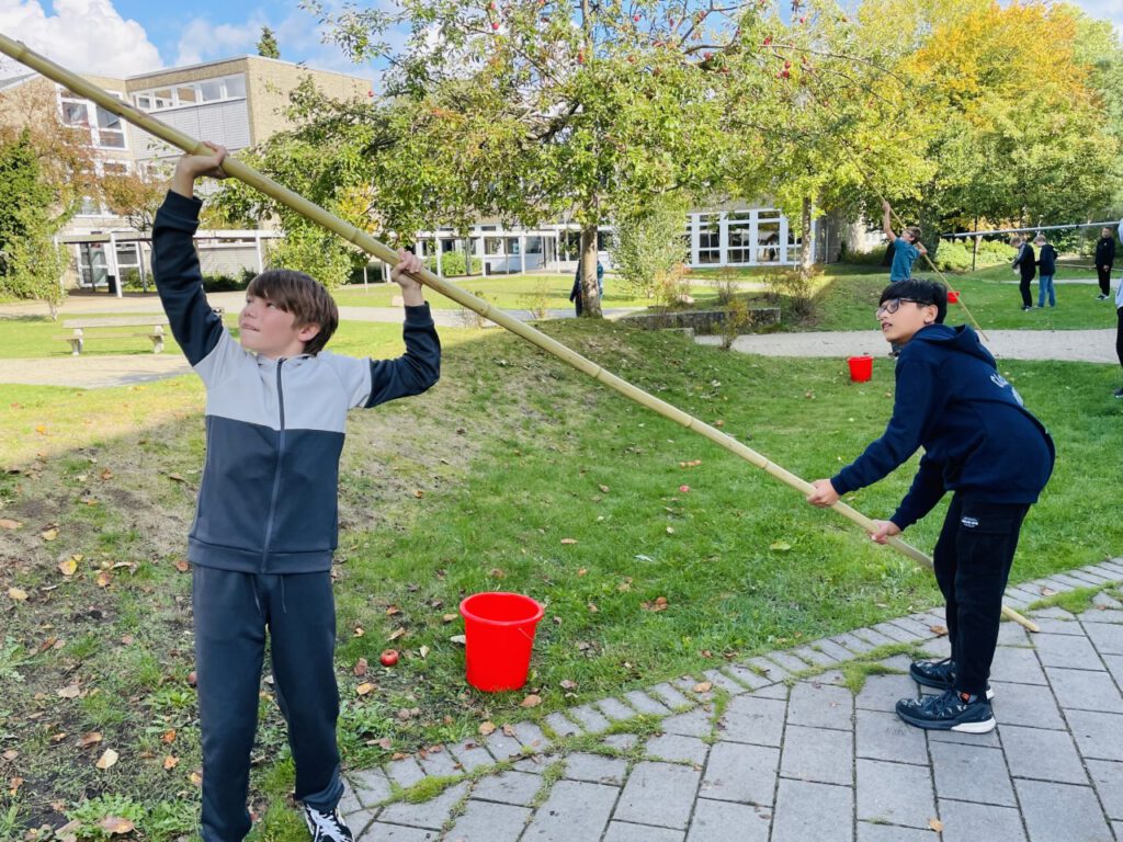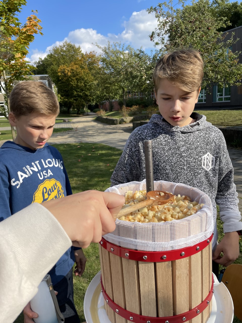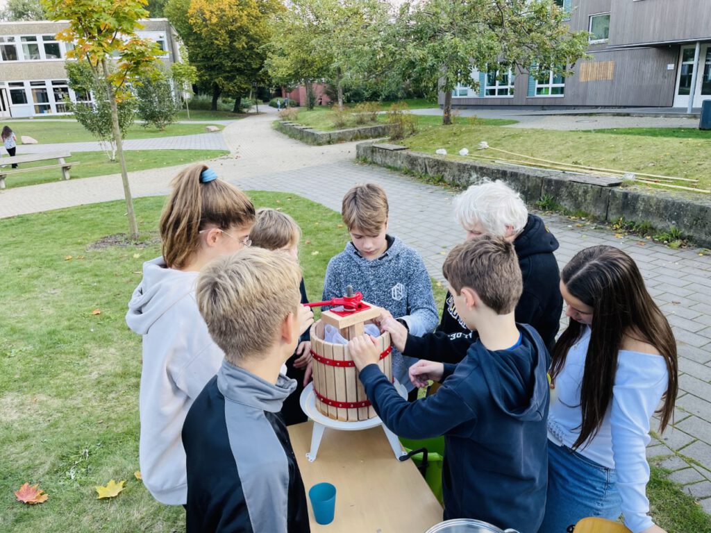 Am vergangenen Freitag, den 30. September 2022, begann das verlängerte Wochenende für die 7c nicht um 13:05 Uhr wie für alle anderen Schülerinnen und Schüler. Stattdessen ging es nach dem Sportunterricht freiwillig zurück ins Klassenzimmer, wo Frau Aßmann, Frau Ohnesorge und Frau Reif sowie die bei Smileys bestellte Pizza warteten. Gestärkt ging es danach an die Arbeit: Äpfel ernten mit den über zwei Meter langen Apfelpflückern (was sich als gar nicht so einfach herausstellte), Äpfel schälen, entkernen und schneiden und natürlich das Verarbeiten der Äpfel zu Apfelsaft. Frau Aßmann hatte extra ihre Apfelpresse dafür mitgebracht. „Säuerlich, aber köstlich“, so lautete das Urteil der Kinder, die den Apfelsaft gleich kosteten. Auch Apfelmus wurde gekocht. Obwohl die Aktion dreieinhalb Stunden dauerte, sind noch immer viele Äpfel an den Bäumen. Vielleicht hat ja auch eine andere Klasse Lust, Äpfel zu ernten? Die 7c und ihre Klassenlehrerinnen können diese Aktion auf jeden Fall nur wärmstens empfehlen.