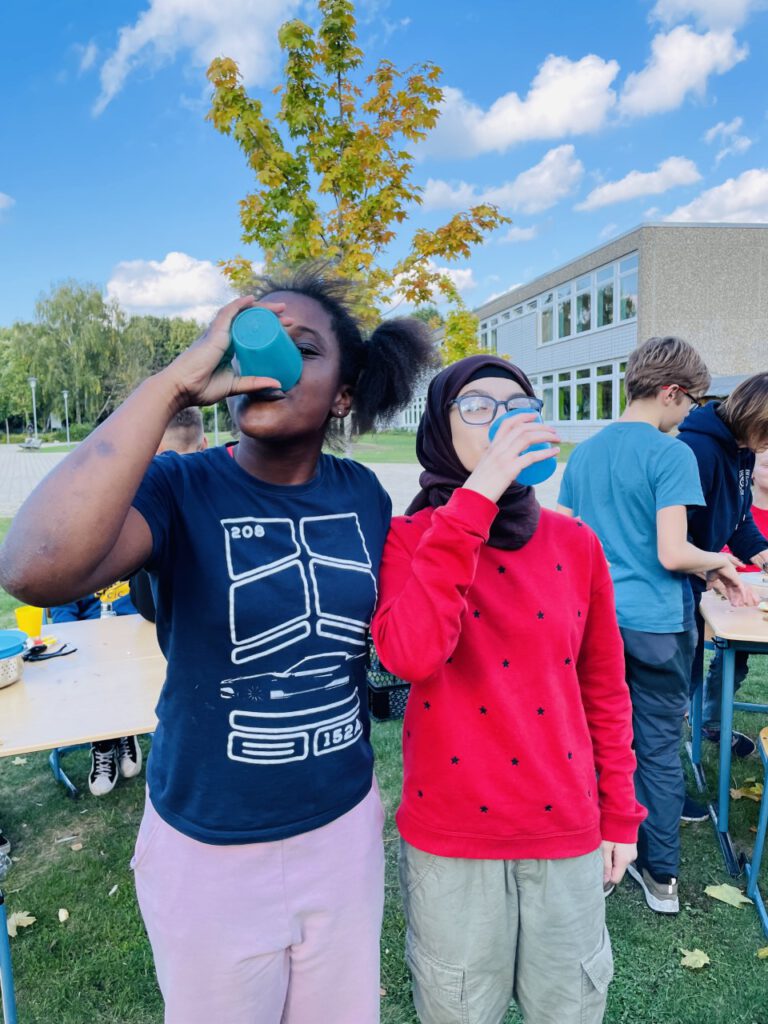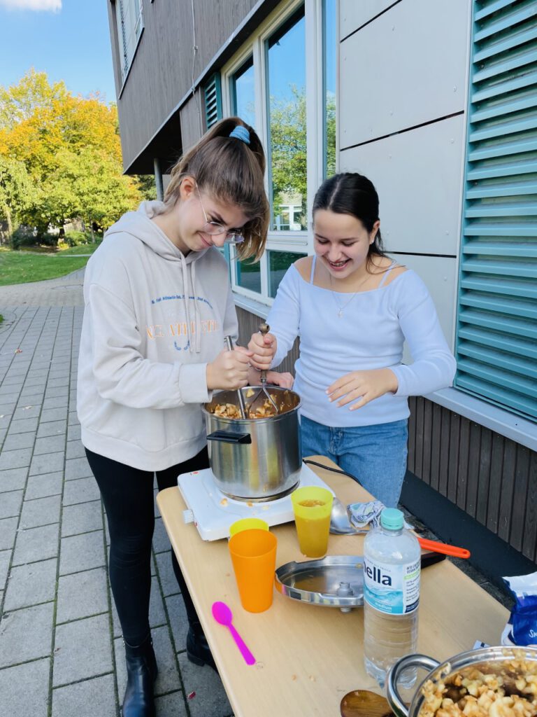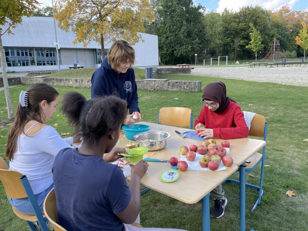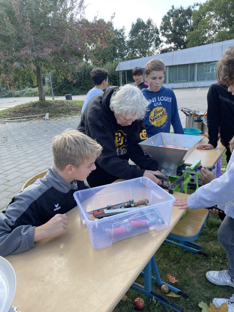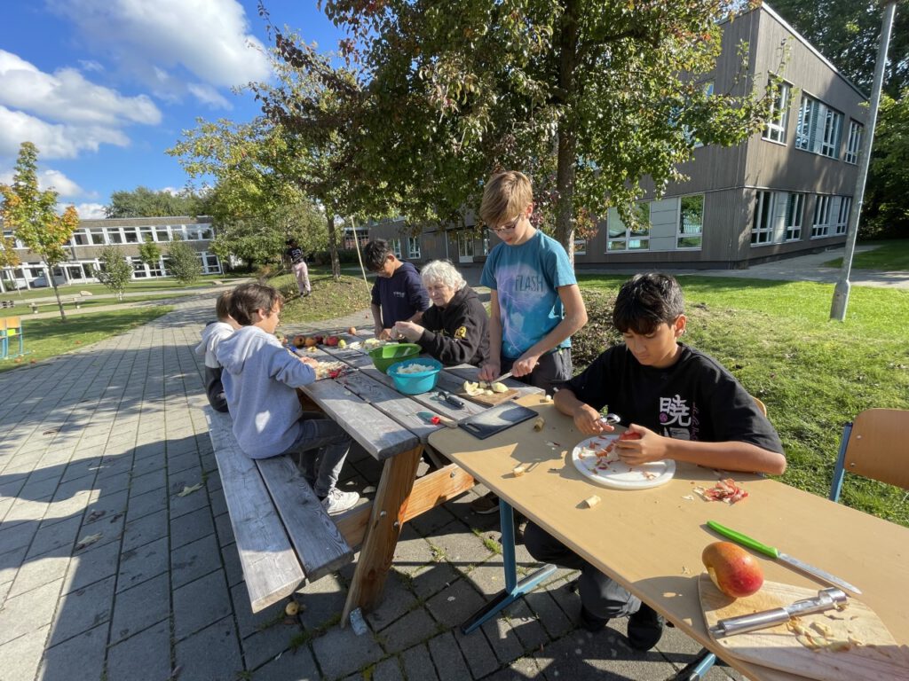 Am vergangenen Freitag, den 30. September 2022, begann das verlängerte Wochenende für die 7c nicht um 13:05 Uhr wie für alle anderen Schülerinnen und Schüler. Stattdessen ging es nach dem Sportunterricht freiwillig zurück ins Klassenzimmer, wo Frau Aßmann, Frau Ohnesorge und Frau Reif sowie die bei Smileys bestellte Pizza warteten. Gestärkt ging es danach an die Arbeit: Äpfel ernten mit den über zwei Meter langen Apfelpflückern (was sich als gar nicht so einfach herausstellte), Äpfel schälen, entkernen und schneiden und natürlich das Verarbeiten der Äpfel zu Apfelsaft. Frau Aßmann hatte extra ihre Apfelpresse dafür mitgebracht. „Säuerlich, aber köstlich“, so lautete das Urteil der Kinder, die den Apfelsaft gleich kosteten. Auch Apfelmus wurde gekocht. Obwohl die Aktion dreieinhalb Stunden dauerte, sind noch immer viele Äpfel an den Bäumen. Vielleicht hat ja auch eine andere Klasse Lust, Äpfel zu ernten? Die 7c und ihre Klassenlehrerinnen können diese Aktion auf jeden Fall nur wärmstens empfehlen.