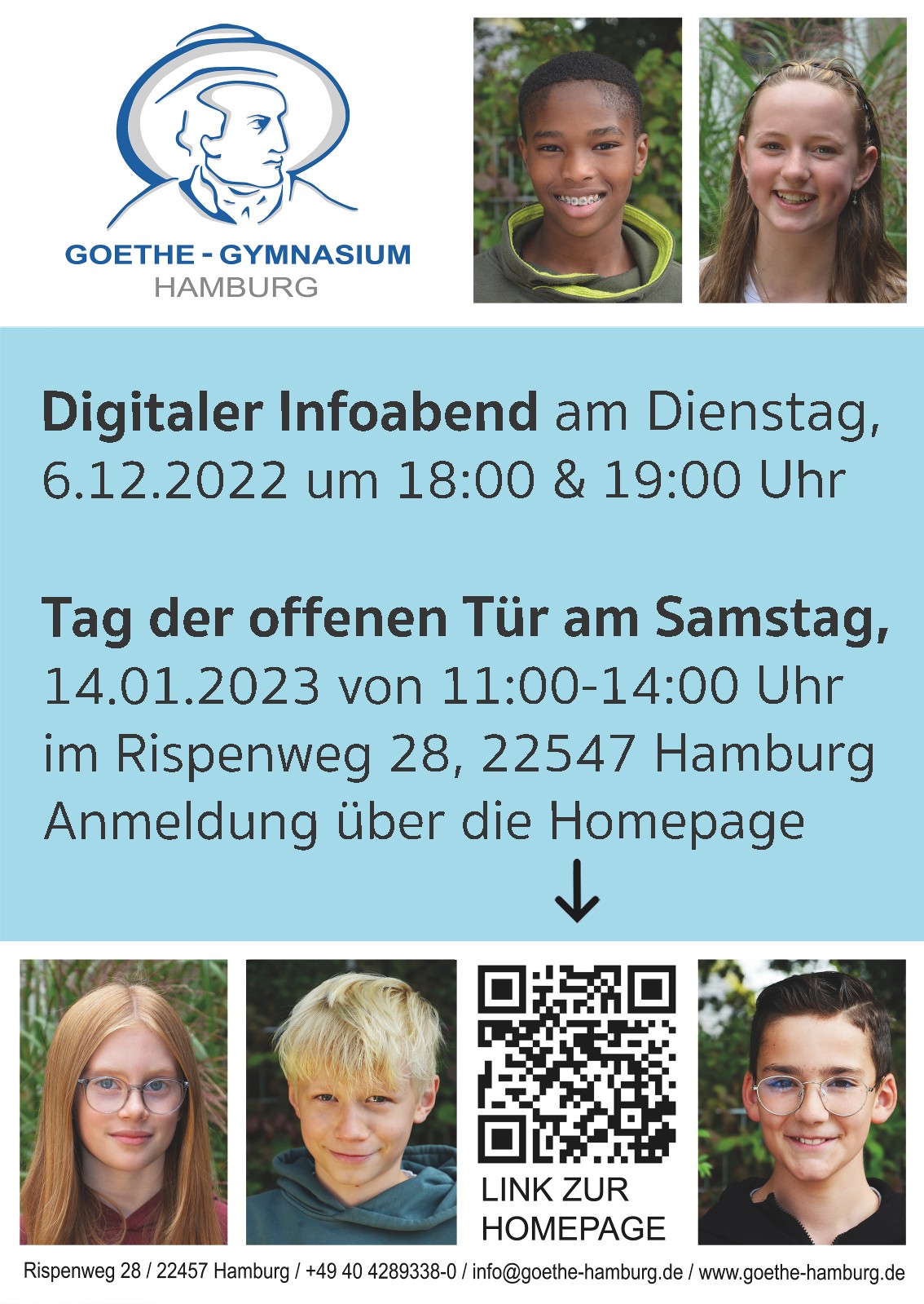 Am Dienstag, den 6. Dezember freuen wir uns, Sie und Ihre Kinder beim digitalen Infoabend zu treffen. Die Beobachtungsstufenleiterin Frau Haddorp, der Schulleiter Herr Scherler sowie Kolleg:innen der Schule werden Ihnen die Schule in einer interaktiven Videokonferenz vorstellen. Über diesen Link haben Sie die Möglichkeit, sich für Ihren Wunschzeitpunkt um 18 Uhr oder 19 Uhr einzutragen.