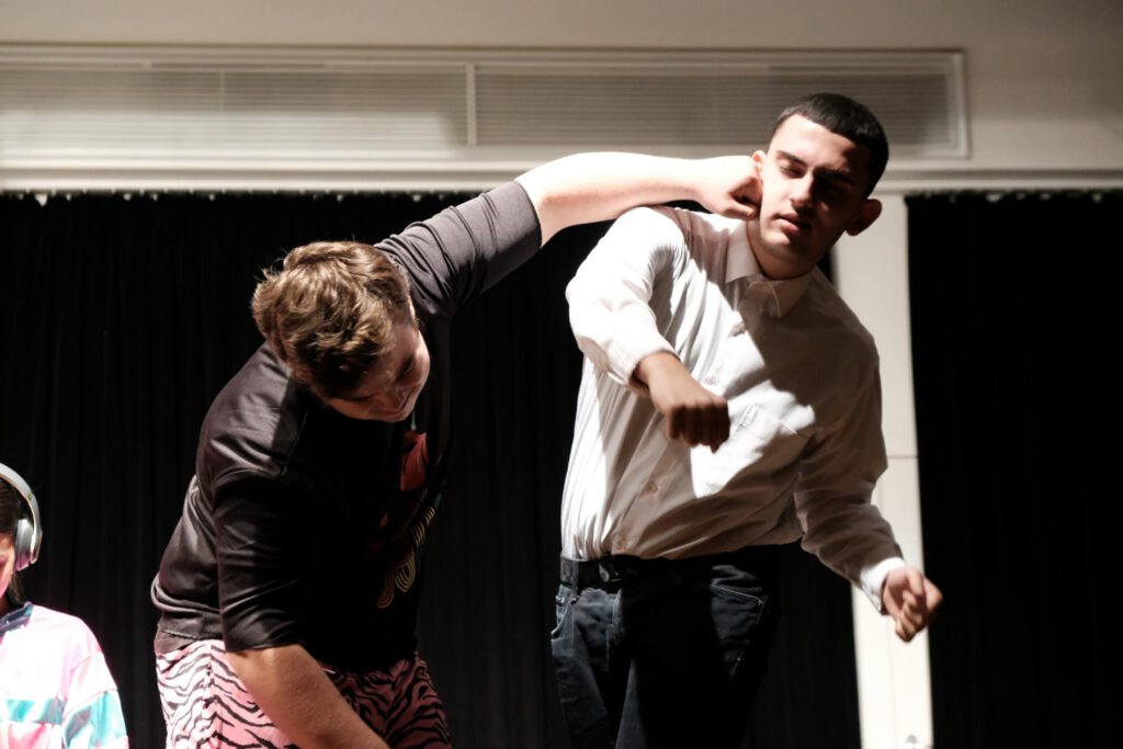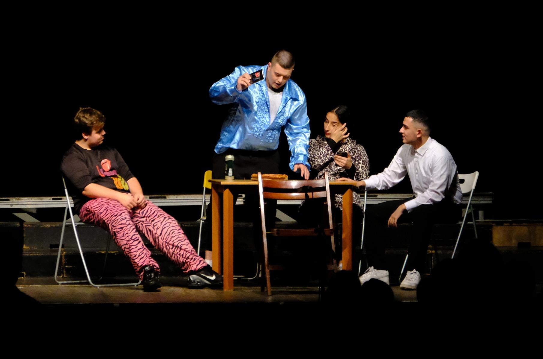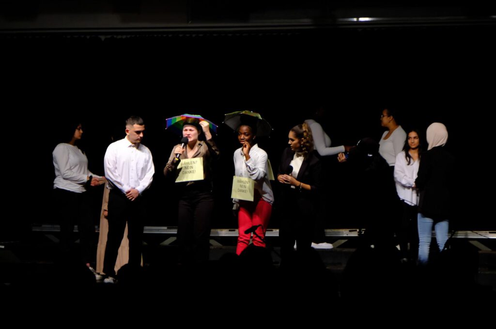Zum Stück: Es ging um die Verständigung zwischen den Menschen, Kommunikation in verschiedensten Facetten, das Reden und verstanden werden. Es begann mit einer spannenden Klang-Collage (Gün S3 Musikprofil) und der lautmalerischen Sprache einer Steinzeitfamilie, die sich um das Essen streitet (S3 + WP10 Lew). Auf die Wiege der Menschheit wurde durch den Song „Africa“ angespielt (Gün, Jun – Großer Chor und Bigband). Von der Sprachverwirrung des eingestürzten „Turm zu Babel“ (Stb Chor) über das romantische Duett „Say Something“ (Alina Ihling, Cemil Jasper; Klavier: Elisabet Milencuk) wurden die Zuschauer in die affektierte Sprache einer barocken Szenerie geführt (Molière „Der Menschenfeind“), bei der es um die Frage ging, ob man immer die Wahrheit sagen sollte, was im späteren Verlauf noch einmal kontrastierend in der Social-Media-Gegenwart thematisiert wurde (Stb S3). Eine moderne Familie zeigte einerseits, wie Kommunikation zuhause bis zur körperlichen Gewalt scheitern kann oder wie man sich mit rhetorisch gewiefter Politikersprache versucht, aus der Hausarbeits-Affäre zu ziehen (Lew S3). Der große Chor und die Bigband (Gün und Jun) schlichteten die Stimmung mit dem Song „L.O.V.E“ und „It don‘t mean a thing“. Medial aufgearbeitet wurde aber auch die bewusste Verweigerung des Mitspracherechts, bei der eine fiktive Organisation von Nichtwählern interviewt wurde (Lew S3). Gegen Ende übernahmen die Sprachassistenten Alexa und Siri und zeigten eine leise Vorahnung darauf, was passiert, wenn künstliche Intelligenzen das Denken und Reden übernehmen sollten (Lew S3), doch ein fulminantes „Final Countdown“ konnte die beiden – zumindest vorerst – stoppen.
