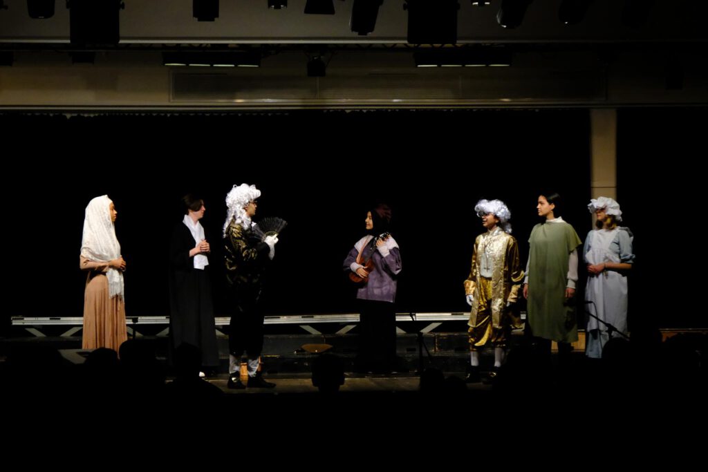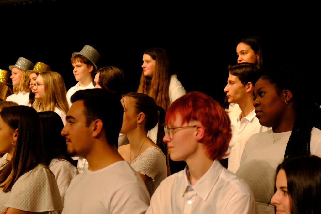 Oktober 2022: Die neue Rev… – nein, nicht Revue, dafür sind die Fußstapfen von Astrid Demattia noch zu groß, aber ein neues Format, was fächerübergreifend die gesanglichen und musikalischen Qualitäten des großen Chores und der Big Band mit schauspielerischen Darbietungen der 12er-Profiltheaterkurse und eines 10er Theaterkurses zu einer episodischen Einheit kombinierte, wurde Anfang Oktober in zwei Vorstellungen präsentiert. Mit weit über hundert beteiligten Schüler:innen, Lehrer:innen und Ehemaligen wurde nach langer Planungs- und Probenarbeit (die teilweise schon ein Jahr vorher begann) und zwei kursübergreifenden Projekttagen zum Zusammenbauen, ein echtes Goethe-Gemeinschaftsprojekt auf die Bühne gebracht. Nach vielen Unsicherheiten und Corona-bedingten Terminverschiebungen sind alle Beteiligten überglücklich mit dem Ergebnis und wir sind sicher, dass das nicht das letzte Mal gewesen sein wird! Ein großes Dankeschön auch für die vielen Spenden, die wir von den Zuschauern erhalten haben, um künftige Projekte dieser Art finanzieren zu können. Besonders zu erwähnen ist hier auch das Technik-Team, was unter neuer Leitung des Schülers Anton Grimm hervorragende Arbeit im Hintergrund geleistet hat.