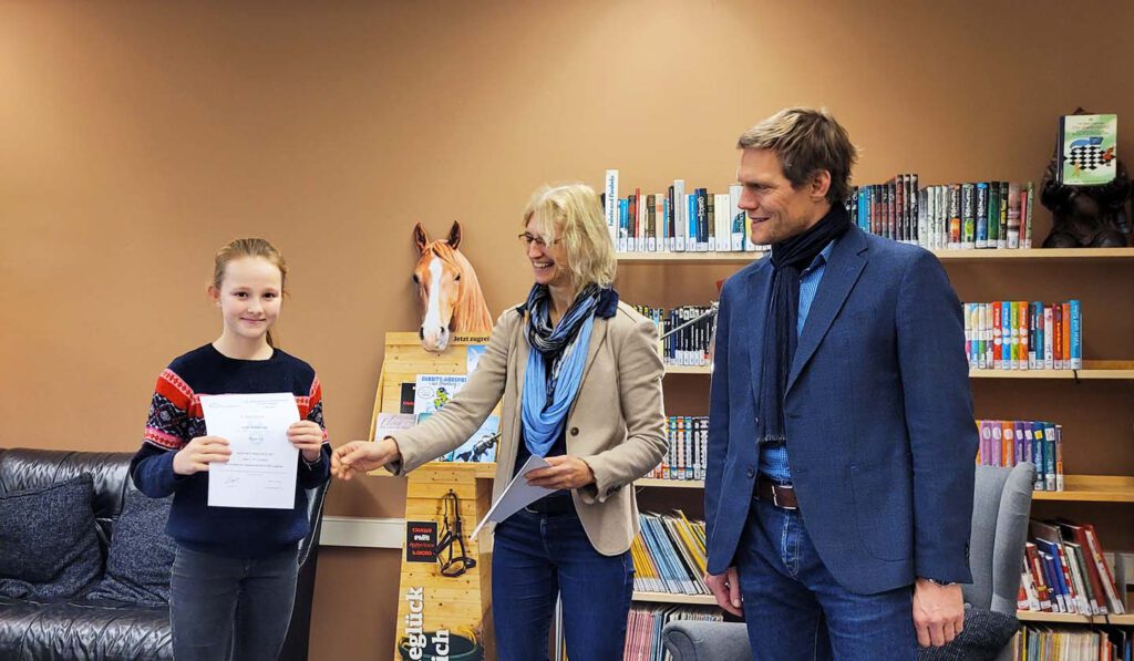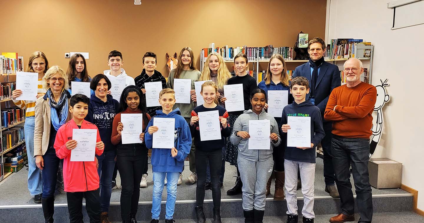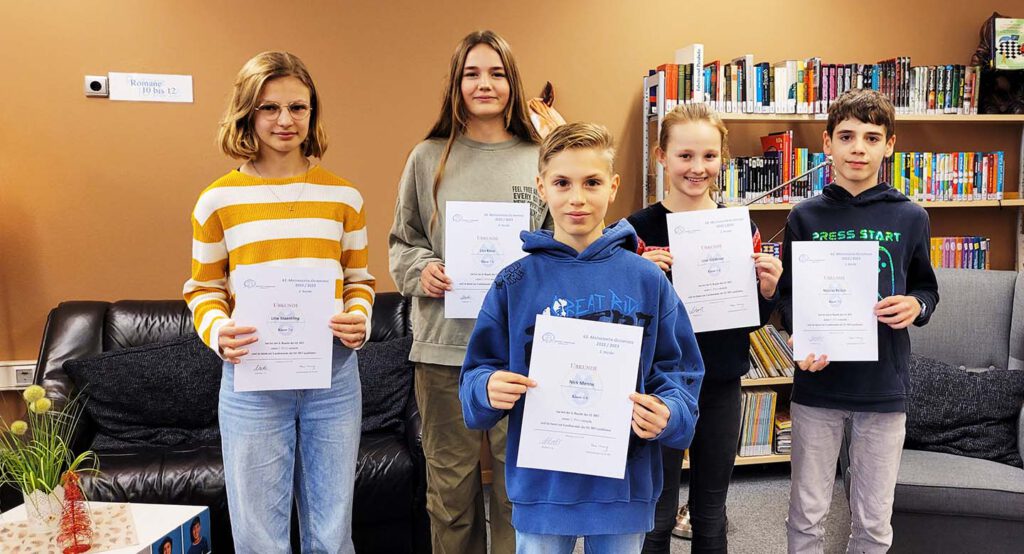 Mittwoch, den 21. Dezember 2022: Heute wurde ein neuer Matherekord aufgestellt: 15 Schüler:innen der Jahrgänge 5 bis 7 bekamen von Schulleiter Frank Scherler und Abteilungsleiterin Conny Haddorp persönlich ihre Urkunde für ihre sehr erfolgreich absolvierte zweite Runde der Matheolympiade überreicht. Mathematisch betrachtet ist das eine Erhöhung um 375 Prozent, da im letzten Jahr lediglich vier Schüler:innen diese Ehre zuteil wurde. Sechs der jungen Mathematiker:innen sind sogar zur Landesrunde im Februar eingeladen und werden dann am Christianeum zwei Tage lang weitere schwierige Aufgaben lösen. Nick Menne (6b), Line Güldener (6d), Lisa Koop (7b), Dorit Christiansen, Nicolas Reisch sowie Lille Staeckling (alle 7c) strahlten über das ganze Gesicht, als ihnen Fachleiterin Sybille Reif zusätzlich eine „Eintrittskarte“ für die sehr begehrte lange Nacht der Mathematik 2023 überreichte.