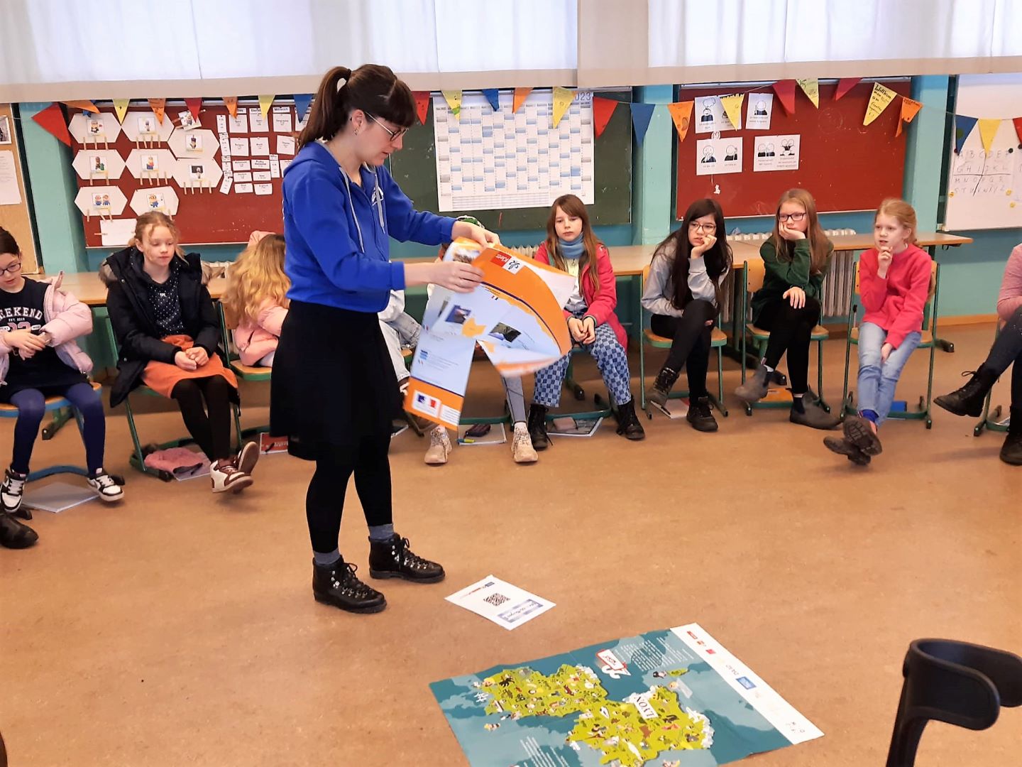 Zusammen mit der französischen Animateurin Ophrys durften dabei alle 5. Klassen auf spielerische Art Kontakt mit der französischen Sprache und Kultur aufnehmen und den frankophonen Sprachraum kennen lernen.