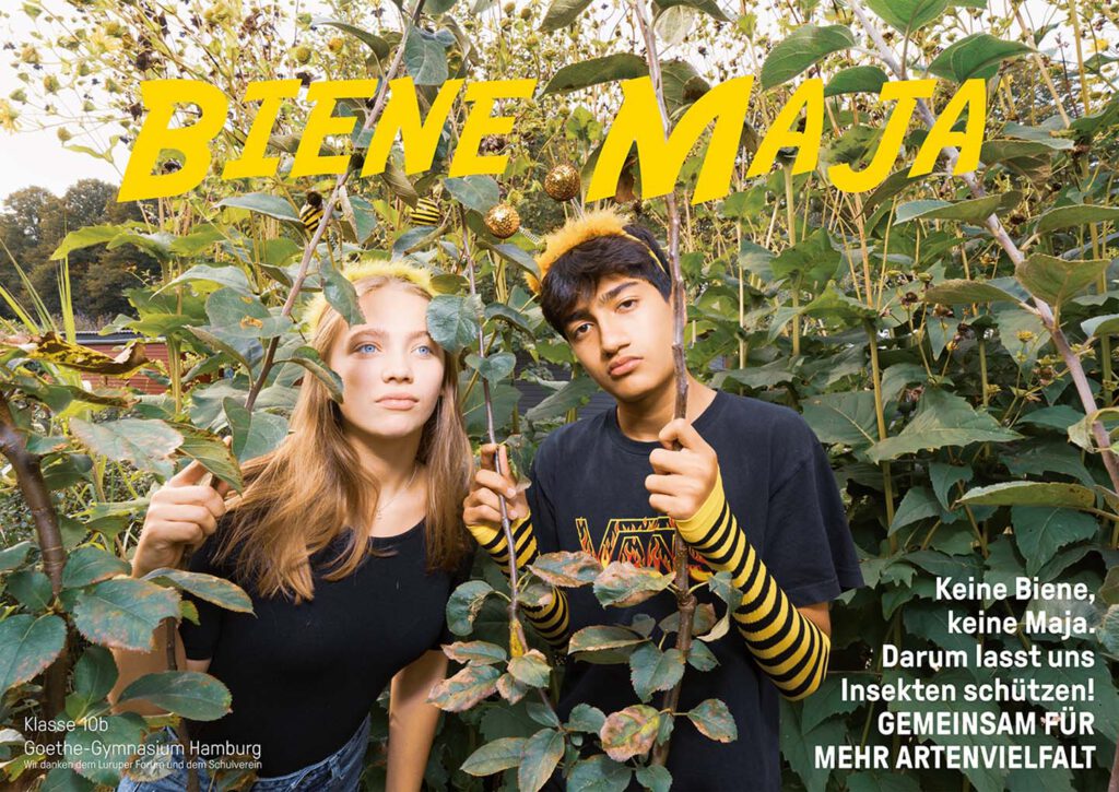 Das Fotoshooting sollte im Grünen stattfinden, genauer gesagt in einem Schrebergarten – das Objekt der Begierde aller Städter in Zeiten von Corona. Professionelle Unterstützung kam vom Fotografen Frederick Vidal, der vor Ort einen Crash Kurs im Fotografieren mit Spiegelreflex und Beauty-Blitz gab. Die Sonnenblumen und Apfelbäumchen wurden derweilen angemessen mit der Bluetooth Box beschallt. Schule im Freien – zu schön um nach Hause zu gehen und so fiel es vielen schwer, nach der 8. Stunde den Unterricht durch das Gartentörchen zu verlassen. Aber es hat sich gelohnt: herausgekommen ist eine fantastische Plakatserie, die vielleicht die Welt rettet!