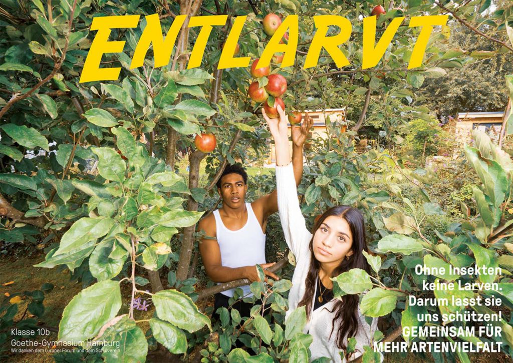Zuvor hatte die Klasse 10b des Goethe-Gymnasiums mit der Klassenlehrerin Frau Götz überlegt, wie man das wichtige Thema Insektenschutz bzw. Artenvielfalt bildnerisch umsetzen könnte. Es fanden sich erstaunlich viele Begriffe, in denen Insekten vorkommen, z.B. „Schmetterlinge im Bauch“, „Entlarvt“, „Bienenstich“ oder „Insektenhotel“- eine Steilvorlage für eine Portraitserie!
