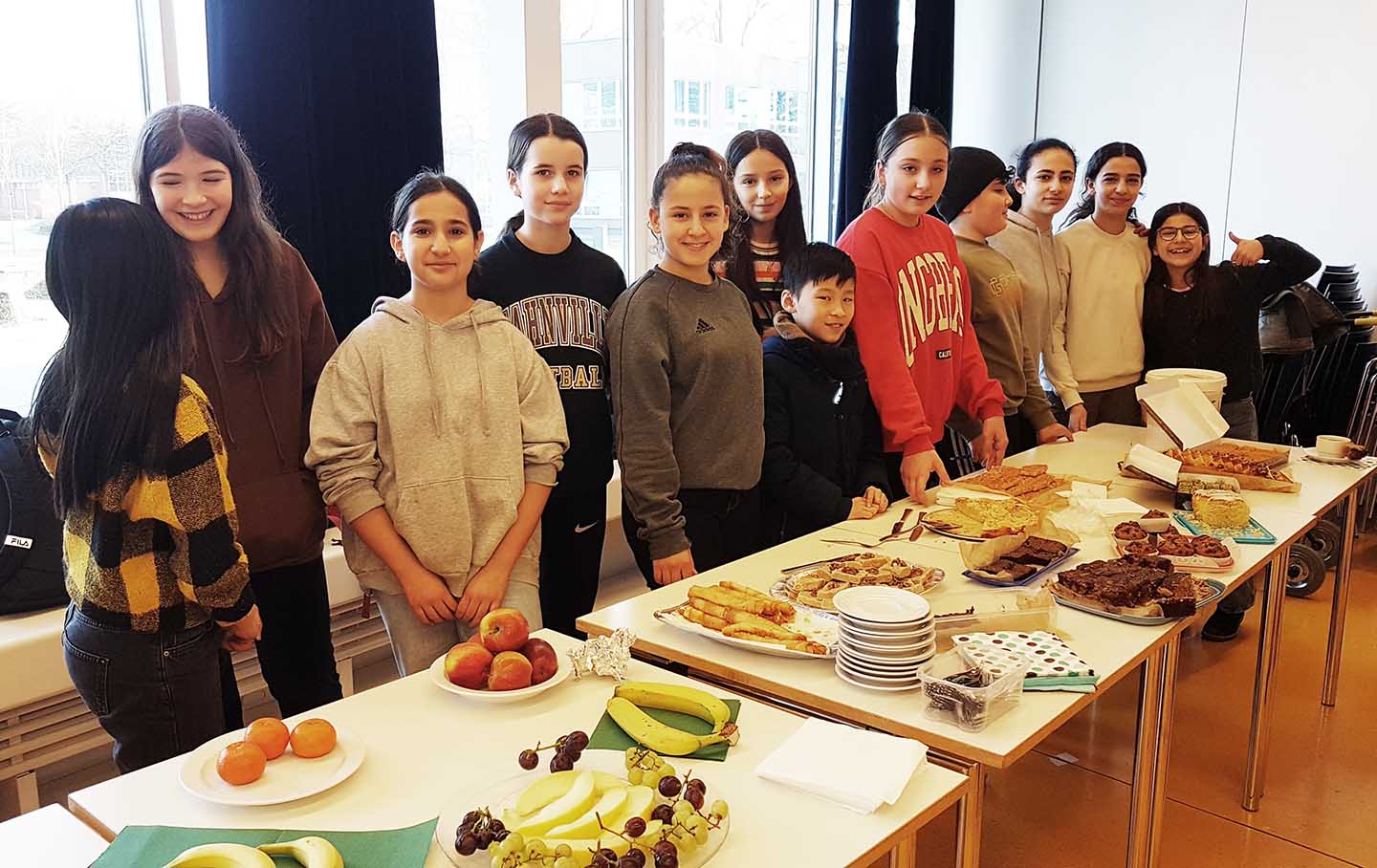 In den Familien der Klasse wurde also gebacken, gekocht und gebraten und Frau Henne hat dann gemeinsam mit der Klasse das Buffet vorbereitet. Nach Unterrichtsschluss ging es los. Die Lehrer:innen waren voll des Lobes für das Engagement der Schüler:innen und die leckeren Speisen. Eine Reihe von Schüler:innen haben sogar das Ende der Konferenz um 17:00 Uhr abgewartet und beim Aufräumen geholfen.