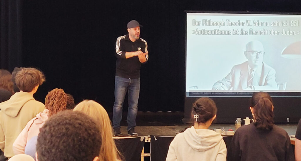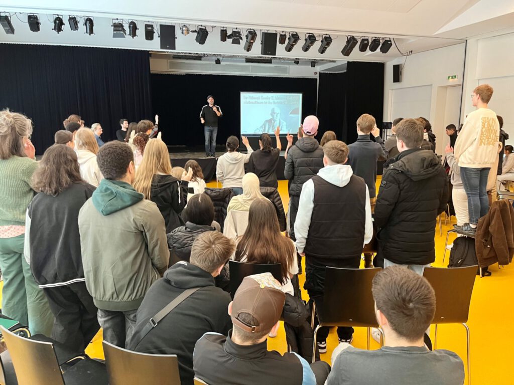 Mittwoch, den 10. Mai 2023: Das Goethe-Gymnasium bekam Besuch vom ehemaligen Rapper Ben Salomo. Er war der Moderator und Gründer der Show “Rap am Mittwoch” und berichtete über den weitverbreiteten Antisemitismus in der Rapszene, unter dem er als Jude selber jahrelang leiden musste. Am Anfang fragte er, wieviele Schüler:innen bereits Antisemitismus in ihrem Umfeld miterlebt hätten. Rund 15% meldeten sich. Nach seiner Aufklärung waren es in etwa 95%. Was war geschehen? Er erzählte sehr anschaulich und mitreißend von seinen Erfahrungen und öffnete uns damit die Augen, wie alltäglich Antisemitismus in unserer Gesellschaft ist, ohne dass wir es wahrnehmen. Neben vielen Quellen und Beweisfotos spielte er uns ein Musikvideo aus der Rapszene vor, wo wir entsetzt erkennen mussten, wie öffentlich Antisemitismus, Frauenfeindlichkeit und Gewalt verherrlicht wurden. Er machte uns auch darauf aufmerksam, wie wir Antisemitismus, oftmals versteckt hinter Gerüchten und Symbolen, erkennen können. Während des gesamten Vortrags sprach Ben Salomo sehr leidenschaftlich und zeitweise glichen seine sprachgewaltigen Sätze selber einem Rap, womit er uns, die Jugend, die selber viel Rap hört, mitriss.