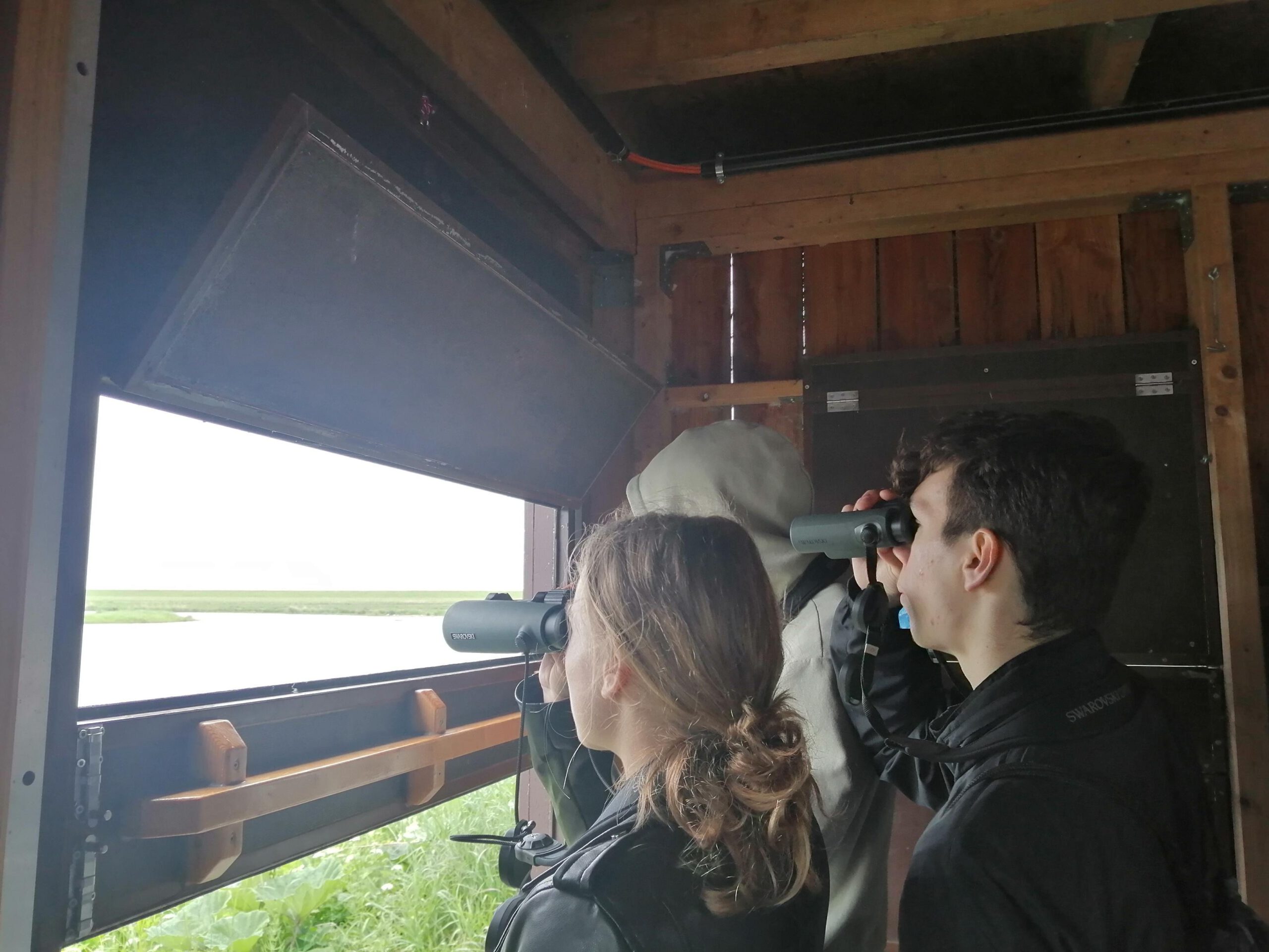 Dort angekommen und gestärkt, wurden wir zunächst von dem NaBu Team vor Ort begrüßt. Zunächst gab es eine allgemeine Einführung zu dem Gebiet (für alle Geo-Interessierten: eine ehemalige Kleie-Entnahmestelle), es folgten einige Erklärungen über die Arbeit und Probleme des Vogelschutzes (das Lied „Fuchs, du hast die Gans gestohlen“ passt da ganz gut) und auch Informationen zum Vogelzug. Dann bekamen alle ein Fernglas, so dass die Beobachtungen losgehen konnten. Dabei sahen wir wirklich viele Enten und Gänse sowie einige andere Arten. Wir erfuhren viel über regelmäßige Wintergäste wie die Weißwangengans, über die sogenannten „Neozoen“, neue Arten, die es früher hier nicht gab, wie die Nilgans und alte Arten, die leider immer mehr bedroht sind durch die Bewirtschaftung der benachbarten Wiesen wie die Kiebitze. Zum Abschluss zeigte sich dann sogar der Seeadler! Der Ausflug war im Schulstress eine willkommene Abwechslung.