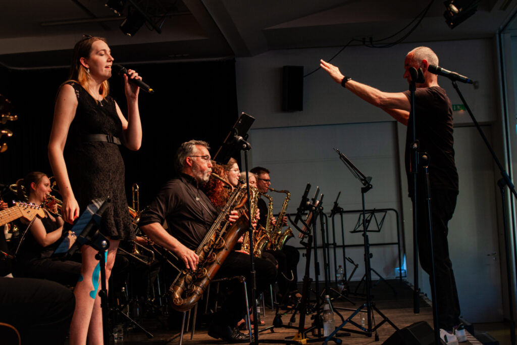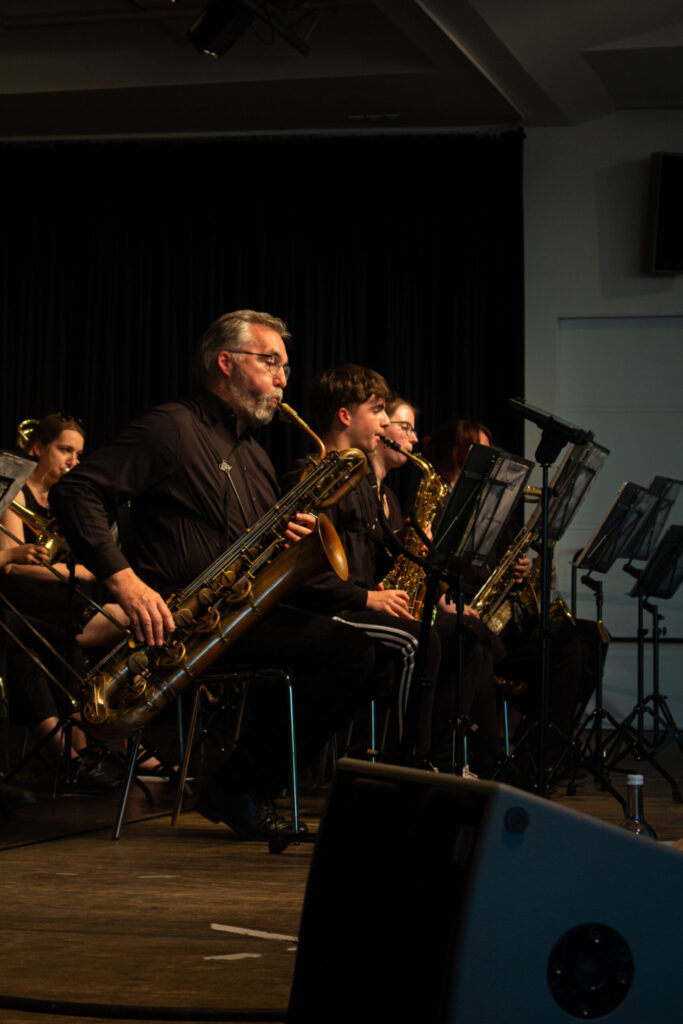 Donnerstag, den 8. Juni 2023: Sie sind eine Tradition: Gemeinsame Konzerte der Bigbands des Goethe-Gymnasiums und Sidewinder. Dies ist kein Zufall, denn Herr Junge, der Bandleader der Schulbigband, ist der Gitarrist der anderen Band. Dieses Mal war die Band Sidewinder aus Harburg zum dritten Mal zu Besuch. Trotz der sommerlichen Temperaturen fanden Musikbegeisterte, zum Teil bereits das dritte Mal innerhalb von zwei Wochen, ihren Weg ins Forum. Das Publikum erwartete ein abwechslungsreiches Programm aus Filmmusik, Jazzstandards, Latinklängen und Rockklassikern. ¡Oye cómo va¡ (Tito Puente) – bereits vor dieser Zugabe brachten die Bläser- und Rhythmusgruppe u.a. mit der Titelmusik zu James Bond und Pink Panther die Füße des Publikums mächtig zum Wippen. Im Anschluss heizte die Band Sidewinder den ohnehin schon gut aufgewärmten Konzertsaal weiter ein und sorgte z.B. mit “Feeling Good” (Anthony Newley / Leslie Bricusse) für gute Stimmung.