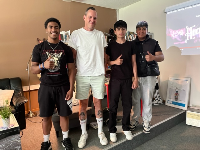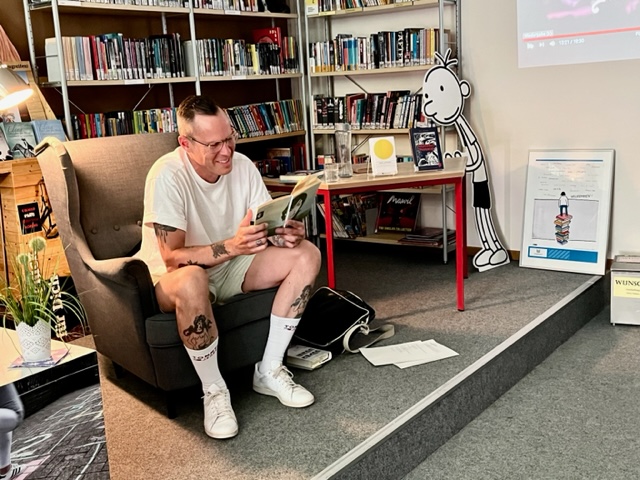 Freitag, den 9. Juni 2023: In der 5./6. Stunde lud Frau Schramm die 10b mit deren Klassenlehrerin Frau Götz in die Schulbibliothek des Goethe-Gymnasiums ein. Dort erwartete uns der Schriftsteller Sven Amtsberg mit seinen Büchern „Paranormale Phänomene“, „Das Mädchenbuch“ und “Superbuhei”. Wir alle dachten zuerst: Schon wieder so eine langweilige Lesung – doch dem war absolut nicht so. Den armen Sven hat es anfangs seines Lebens sehr viel langweiliger als uns erwischt. Er musste in Langenhagen aufwachsen. Das Städtchen bei Hannover ist so öde, dass er aus Protest eine Punkband gründete. Als sie sich auflöste, begann er vor lauter Verzweiflung an zu schreiben. In seinen Geschichten geht es meist um Frauen, Erlebnisse an der Bar oder um Klaus Meine, dem Sänger der Band Scorpions, der zufällig ebenfalls aus Langenhagen kommt. Svens Roman “Superbuhei” wird jetzt sogar verfilmt und der Trailer kam uns überhaupt nicht langweilig vor! Ebensowenig Svens Geschichten zu seinen Tattoos und Lebensweisheiten als Barkeeper, die er sich in langen Nächten im Hamburger Nachtleben erarbeitet hat. Die Klasse lachte oft mit Sven Amtsberg über seine Texte, seine Youtubeauftritte, die wir zu sehen bekamen und seine lockere, sympathische und sehr humorvolle Art. Danke für deine Zeit und für diesen tollen Wochenabschluss, Sven!