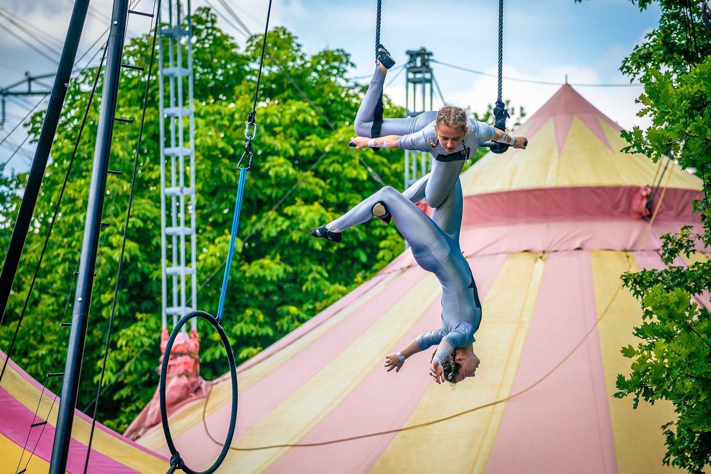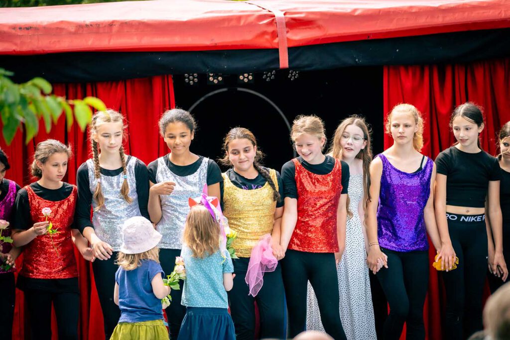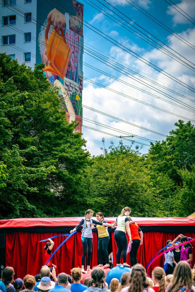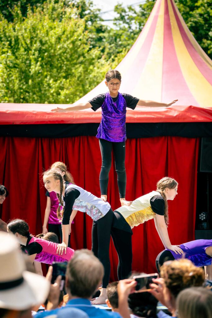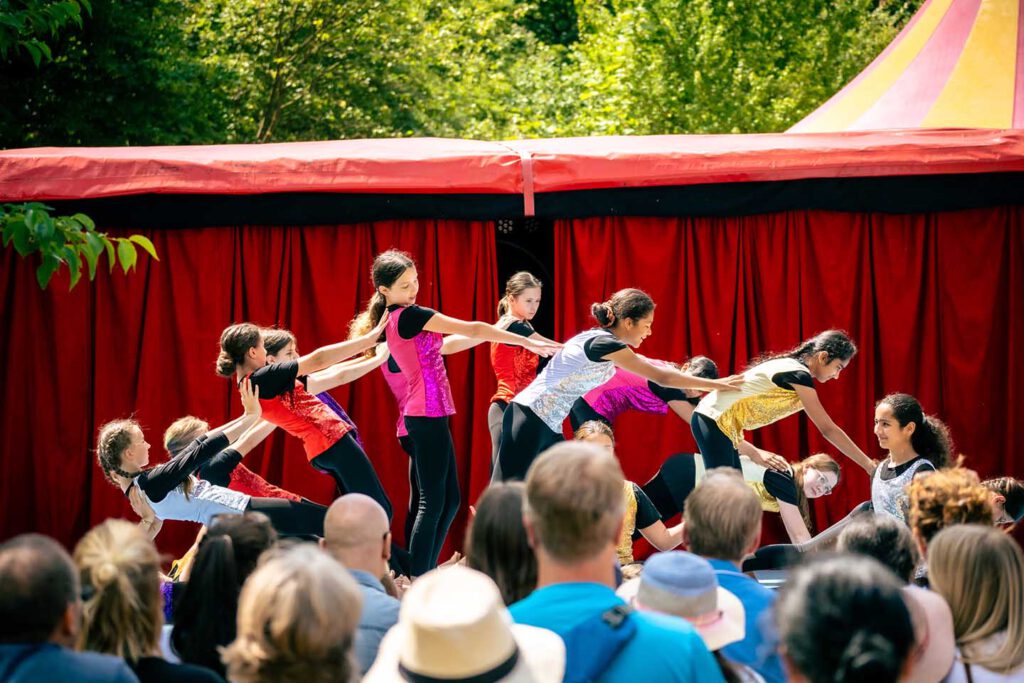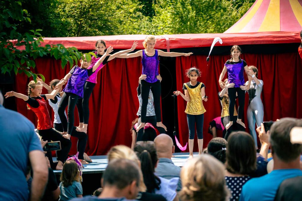 Nach einer kurzen Begrüßung des Publikums wurden wir von der Moderatorin angekündigt und gleich erklang unsere Musik. Vor der schönen Kulisse der Zirkuszelte durften wir bei herrlichstem Sonnenschein unsere Akrobatik- und unsere Kugelnummer präsentieren. Dazwischen hat die Circusschule TriBühne eine Nummer am Trapez und eine am Luftring gezeigt. Dass die Trapeznummer von unseren Kursleiterinnen Benthe und Luzie gezeigt wurde, war besonders schön. So waren wir Artistinnen und Zuschauerinnen zugleich. Im Anschluss bekamen alle, die aufgetreten waren, noch Popcorn, eine Rose und viel Applaus. Wir haben uns dann noch weitere Vorführungen angeschaut und das Fest sehr genossen.