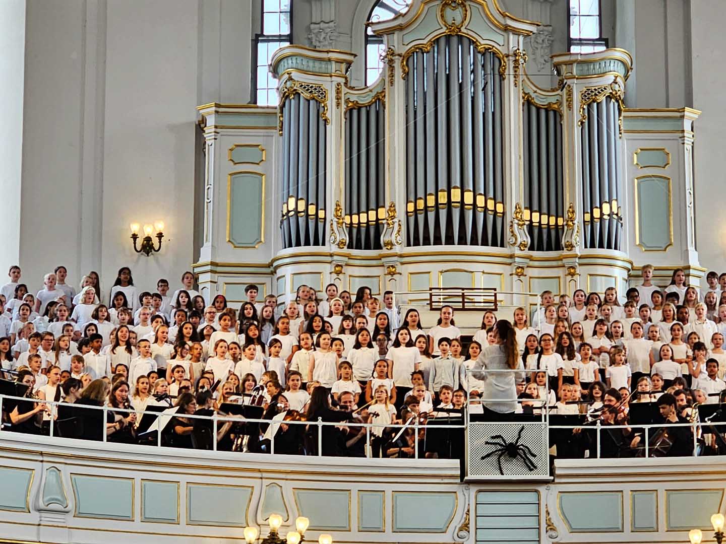 Freitag, den 30. Juni 2023: Die 6C machte sich nach der 1. Stunde begleitet von Frau Lang-Gerdes und Frau Haddorp auf den Weg zum Michel. Nach 45 Minuten S-Bahn-Fahrt und Fußmarsch kamen alle guten Mutes am Michel an. Während sich noch einige die Frage stellten, ob die Zuschauerränge bis in den Kirchturm gehen, genossen andere noch einen Blick auf den Hafen. Im Michel angekommen, nahm die Klasse ihre Plätze in den Kirchbänken ein und bewunderte die Sicht auf die Empore, wo das Orchester schon Platz genommen hatte. Kurz darauf stieg die Aufregung in der Klasse, denn Frau Beilner und der Unterstufenchor mit Eleyna aus der 6C wurden auf der Empore hinter dem Orchester entdeckt. Es wurde wild gewunken und gestrahlt.