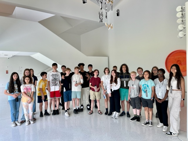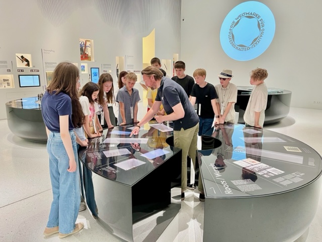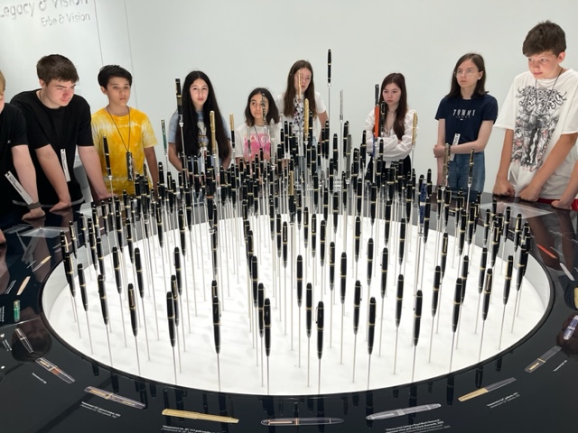Dienstag, 11. Juli 2023: Am vorletzten Schultag noch spontan auf den Montblanc? Diese wahnwitzige Idee hatte Frau Götz und schon schnürte die Klasse 7d ihre Bergstiefel und wanderte zu Beginn der dritten Stunde los. Die 7d ist schon einiges aus dem Kunstunterricht gewöhnt – aber als sie schon nach 10 Minuten Marsch das schwarze Bergmassiv der Fassade des Montblanc-Hauses erblickte, war sie sehr froh. In zwei Gruppen aufgeteilt erfuhr die Klasse, dass die Firma Montblanc direkt hinter dem Goethe-Gymnasium seit vielen Jahren ihre Produktions- und Vertriebsstätte hat. Dort werden tatsächlich die hochwertigen Füller hergestellt, die auch schon in James-Bond-Filmen zum Einsatz kamen! In der Ausstellung wurden sogar Füller aus Spezial-Editionen verziert mit Diamanten ausgestellt – Preisklasse eines halben Bugatti Chiron. Gratis durfte mit den Füllern immerhin schon mal Postkarten geschrieben werden. Und wer dem Geheimnis rund um die Schreibfederspitzen aus Gold noch näher kommen möchte: Die Firma Montblanc bietet mehrere Azubiplätze im Jahr im handwerklichen Bereich an. Ein Geheimtipp fürs Vorstellungsgespräch erfuhren wir bei der Führung auch noch: 4810 Meter – so hoch liegt der Montblanc in den Alpen und deswegen ist die Zahl auf den Federspitzen eingraviert. Vielen Dank an das Team des Montblanc-Hauses für die tollste Doppelstunde in luftiger Höhe vor den Sommerferien!