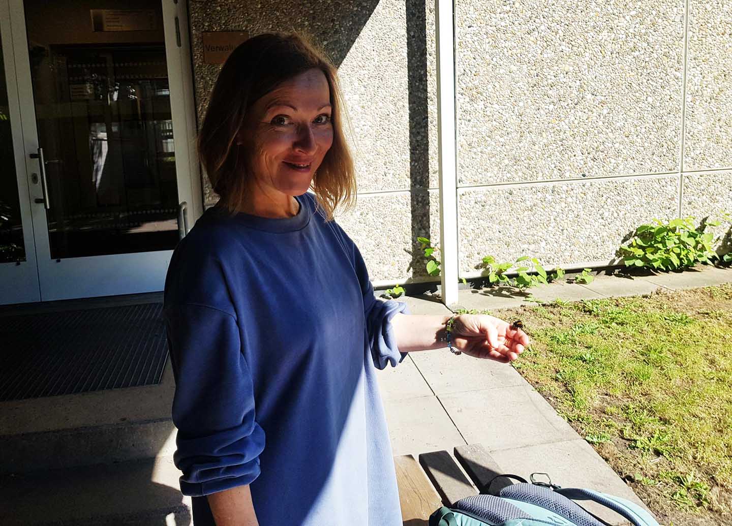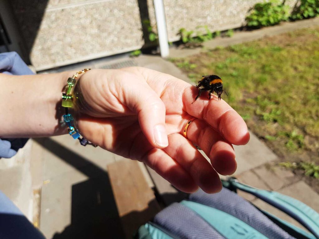 Freitag, den 15. September 2023: Frau Karstädt hat eine Hummel vor dem Verwaltungstrakt gerettet! Das arme Tier im Ringelpelz lag hilflos und völlig erschöpft auf dem Boden, als sie von Frau Karstädt entdeckt wurde, die sofort in die Lehrerküche eilte, um ein Schälchen mit Zuckerwasser zu bereiten. Die Wiederbelebung ist geglückt- sichtlich zufrieden sitzt die Hummel auf der rettenden Hand und schlürft verzückt die süße Medizin! Danke an die beherzte Retterin.