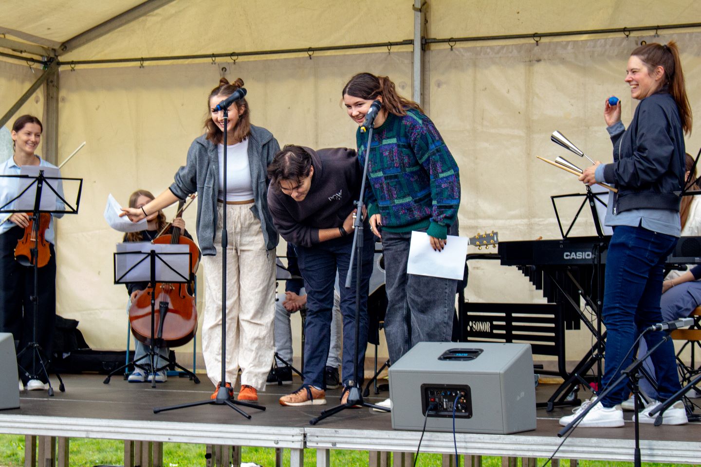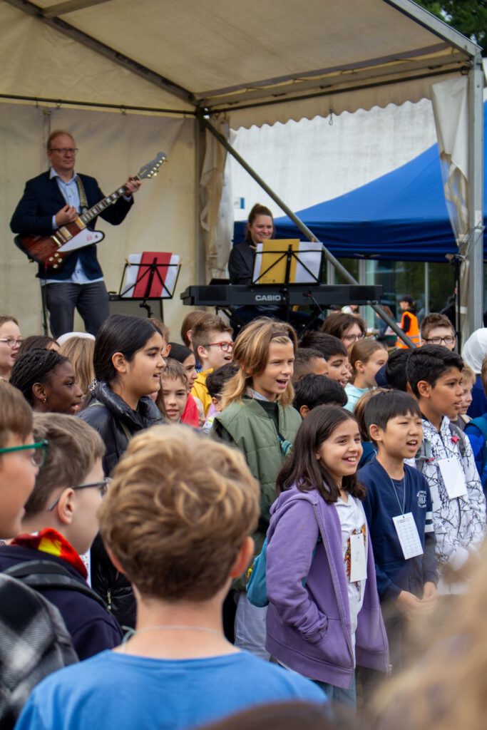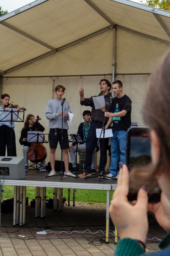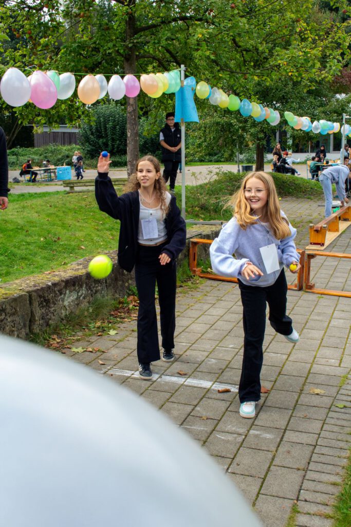 Samstag, den 23. September 2023: Buntes Treiben auf dem Schulgelände. Und das am Wochenende! BUNT – das Motto der diesjährigen Feierlichkeit spiegelte sich in allen Bereichen wider, denn es gab viel zu sehen, zu bespielen, zu entdecken, zu hören, zu riechen, zu fühlen und natürlich zu essen. Von Escape Rooms, Wer wird Millionär, Parcours, Menschenkicker, Minigolf bis hin zu Batiken und Face-Painting. Die Klassen und Profile der Schule haben sich ordentlich ins Zeug gelegt, um den Besucher:innen eine bunte Vielfalt an interessanten Ständen, mitreißenden Aktionen und kreativen Oasen zu bieten. Ausgestattet mit einer Stempelkarte konnten die Schüler:innen, wenn sie nicht gerade den Stand ihrer eigenen Lerngruppe mit großartigem Engagement betreuten, mit ihren Freund:innen und Familienangehörigen an rund 30 bunten Stationen Stempeln für die große Auslosung am Ende sammeln. Stärken konnten sich die Teilnehmenden zum einen an den Essensständen der fünften Klassen, die für einen kleinen Taler schmackhaftes Fingerfood anboten, und zum anderen an dem Stand des Elternrates, welcher gegrillte Würstchen und kühle Getränke bereitstellte. Alkoholfreie Cocktails für einen wohltätigen Zweck verkaufte die Oberstufe mit dem Ziel, die Erdbebenopfer in Marokko zu unterstützen. Für die anhaltend gute Stimmung sorgte auch das vielfältige Bühnenprogramm. Neben Live-Karaoke und Livemusik auf der Außenbühne und im Forum präsentierten sich auch die Ganztagskurse, wie etwa das Young Modern Dance Ensemble in der Turnhalle. Es gab viel Raum für persönliche Begegnungen und Austausch, was der Schulgemeinschaft nach der langen Coronapause richtig gut tat.