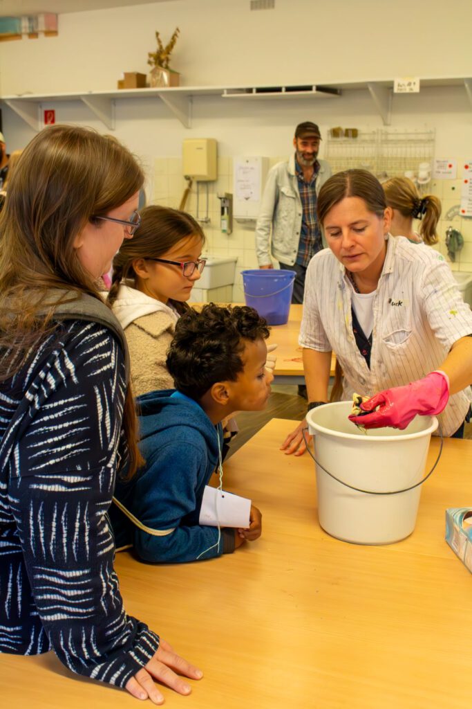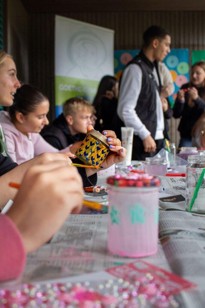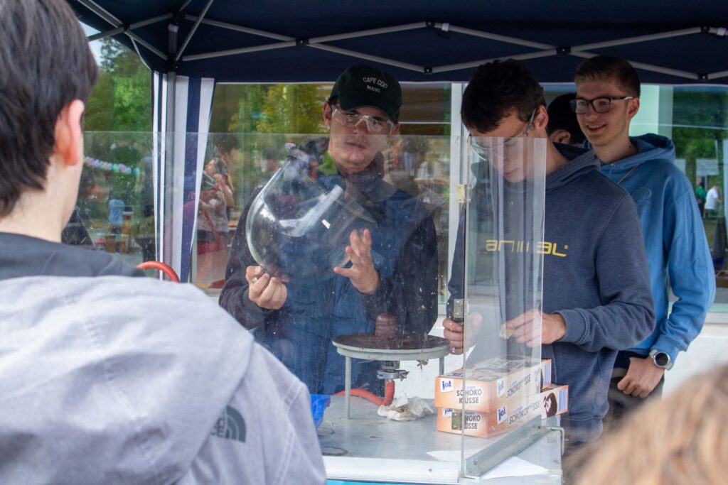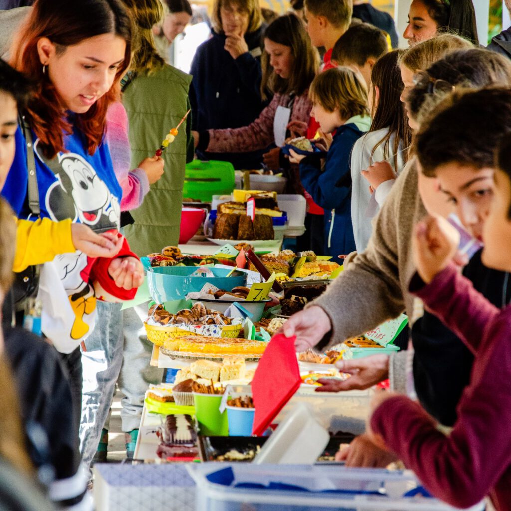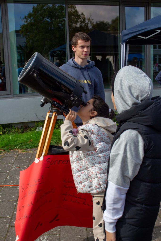 Samstag, den 23. September 2023: Buntes Treiben auf dem Schulgelände. Und das am Wochenende! BUNT – das Motto der diesjährigen Feierlichkeit spiegelte sich in allen Bereichen wider, denn es gab viel zu sehen, zu bespielen, zu entdecken, zu hören, zu riechen, zu fühlen und natürlich zu essen. Von Escape Rooms, Wer wird Millionär, Parcours, Menschenkicker, Minigolf bis hin zu Batiken und Face-Painting. Die Klassen und Profile der Schule haben sich ordentlich ins Zeug gelegt, um den Besucher:innen eine bunte Vielfalt an interessanten Ständen, mitreißenden Aktionen und kreativen Oasen zu bieten. Ausgestattet mit einer Stempelkarte konnten die Schüler:innen, wenn sie nicht gerade den Stand ihrer eigenen Lerngruppe mit großartigem Engagement betreuten, mit ihren Freund:innen und Familienangehörigen an rund 30 bunten Stationen Stempeln für die große Auslosung am Ende sammeln. Stärken konnten sich die Teilnehmenden zum einen an den Essensständen der fünften Klassen, die für einen kleinen Taler schmackhaftes Fingerfood anboten, und zum anderen an dem Stand des Elternrates, welcher gegrillte Würstchen und kühle Getränke bereitstellte. Alkoholfreie Cocktails für einen wohltätigen Zweck verkaufte die Oberstufe mit dem Ziel, die Erdbebenopfer in Marokko zu unterstützen. Für die anhaltend gute Stimmung sorgte auch das vielfältige Bühnenprogramm. Neben Live-Karaoke und Livemusik auf der Außenbühne und im Forum präsentierten sich auch die Ganztagskurse, wie etwa das Young Modern Dance Ensemble in der Turnhalle. Es gab viel Raum für persönliche Begegnungen und Austausch, was der Schulgemeinschaft nach der langen Coronapause richtig gut tat.