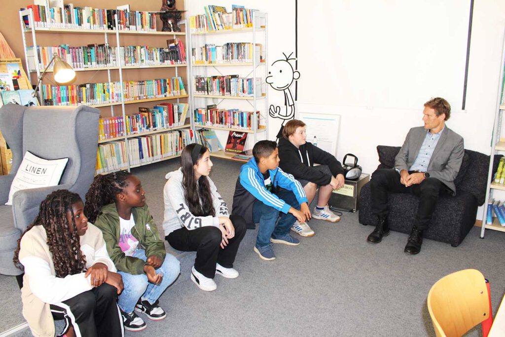 Mittwoch, den 27. September 2023: Herr Scherler kam in der Mittagspause höchstpersönlich in die Schulbibliothek, um den glücklichen Gewinner:innen unseres Schulfestes am Samstag zu gratulieren und vor allem die Preise zu überreichen. Die Hauptgewinne in Form XXXL Schokolode gingen an Adel aus der 6b, Shahd aus der 8d und Revan aus der 10a, die heute den Preis leider nicht persönlich entgegen nehmen konnte. Ali und Paul aus der 10a haben den Preis aber für sie mitgenommen.