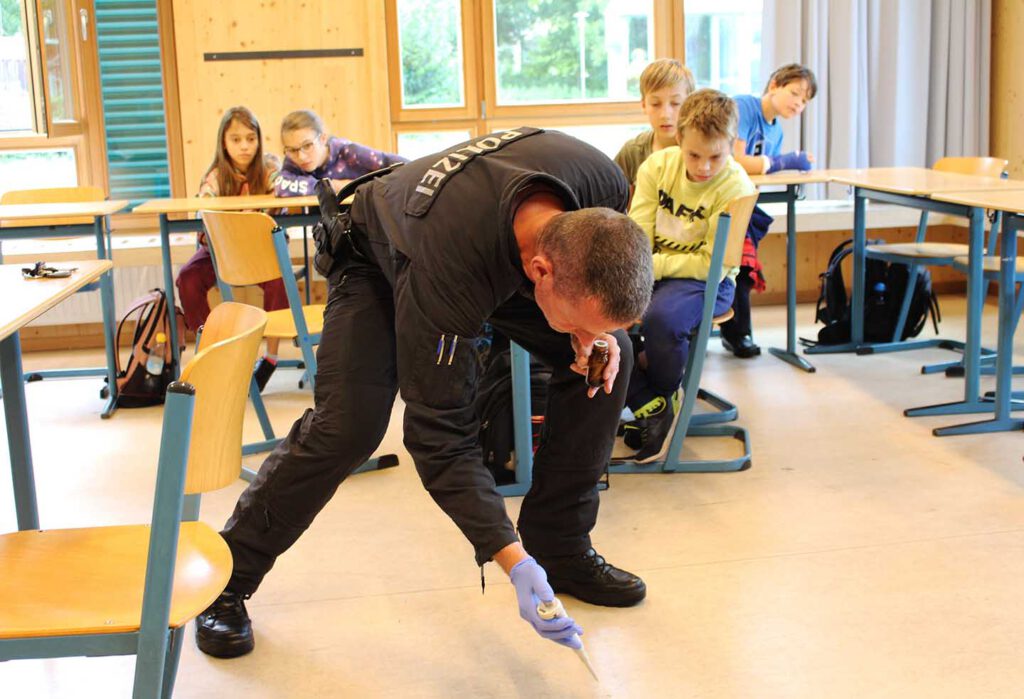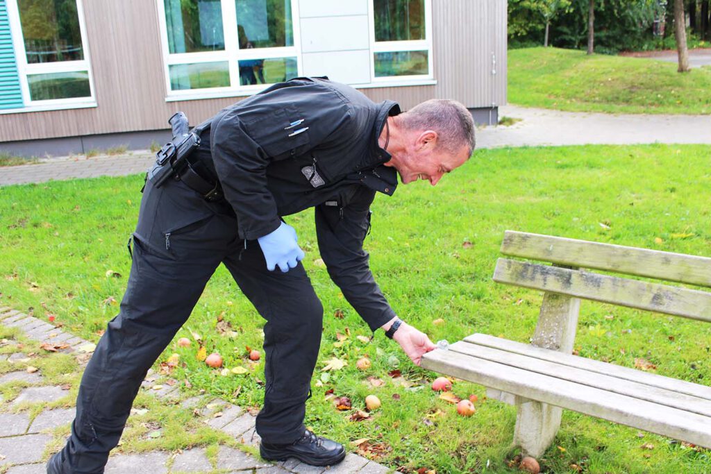 Ihr fragt euch, was genau ein Makrosmatiker ist? Diese arbeiten ganz klar mit ihrer Nase! Black ist ein Brandmittelspürhund und seit neun Jahren mit seinem Herrchen Heiko Valli bei der Hamburger Polizei im Einsatz. Bevor er aus seinem Zwinger im Auto auf den Campus gelassen wird, verteilt Herr Valli mit der sogenannten Eppendorfspritze, die auch bei CSI Miami z.B. angewandt wird, einen Hauch von Benzintropfen im Neubau und platziert ein minimal benzingetränktes Taschentuch draußen auf einer unserer Pausenbänke.