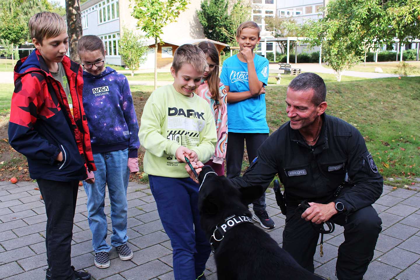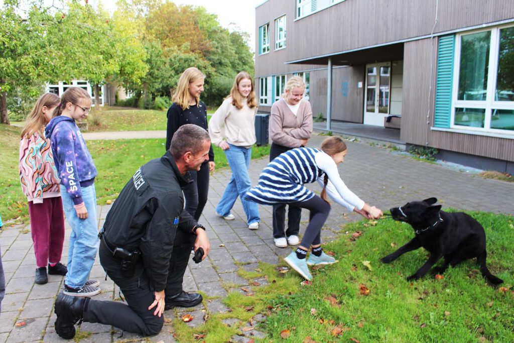 Mittwoch, den 4. Oktober 2023: Am Tag zuvor war er noch schnuppernd im Michel unterwegs gewesen, um sicherzustellen, dass die Feierlichkeiten am Tag der Deutschen Einheit reibungslos verlaufen würden und heute ist dieser berühmte Makrosmatiker BLACK in unserem Differenzierungskurs “Rund um den Hund” von Frau Haddorp zu Gast. Ihr fragt euch, was genau ein Makrosmatiker ist? Diese arbeiten ganz klar mit ihrer Nase! Black ist ein Brandmittelspürhund und seit neun Jahren mit seinem Herrchen Heiko Valli bei der Hamburger Polizei im Einsatz. Bevor er aus seinem Zwinger im Auto auf den Campus gelassen wird, verteilt Herr Valli mit der sogenannten Eppendorfspritze, die auch bei CSI Miami z.B. angewandt wird, einen Hauch von Benzintropfen im Neubau und platziert ein minimal benzingetränktes Taschentuch draußen auf einer unserer Pausenbänke. Und schon geht es für Black an die Arbeit- blitzschnell deckt er beide Gefahrenquellen auf! Zur Belohnung gibt es Leckerlis und Spiel- sowie Streicheleinheiten und eine Menge Respekt und Anerkennung.