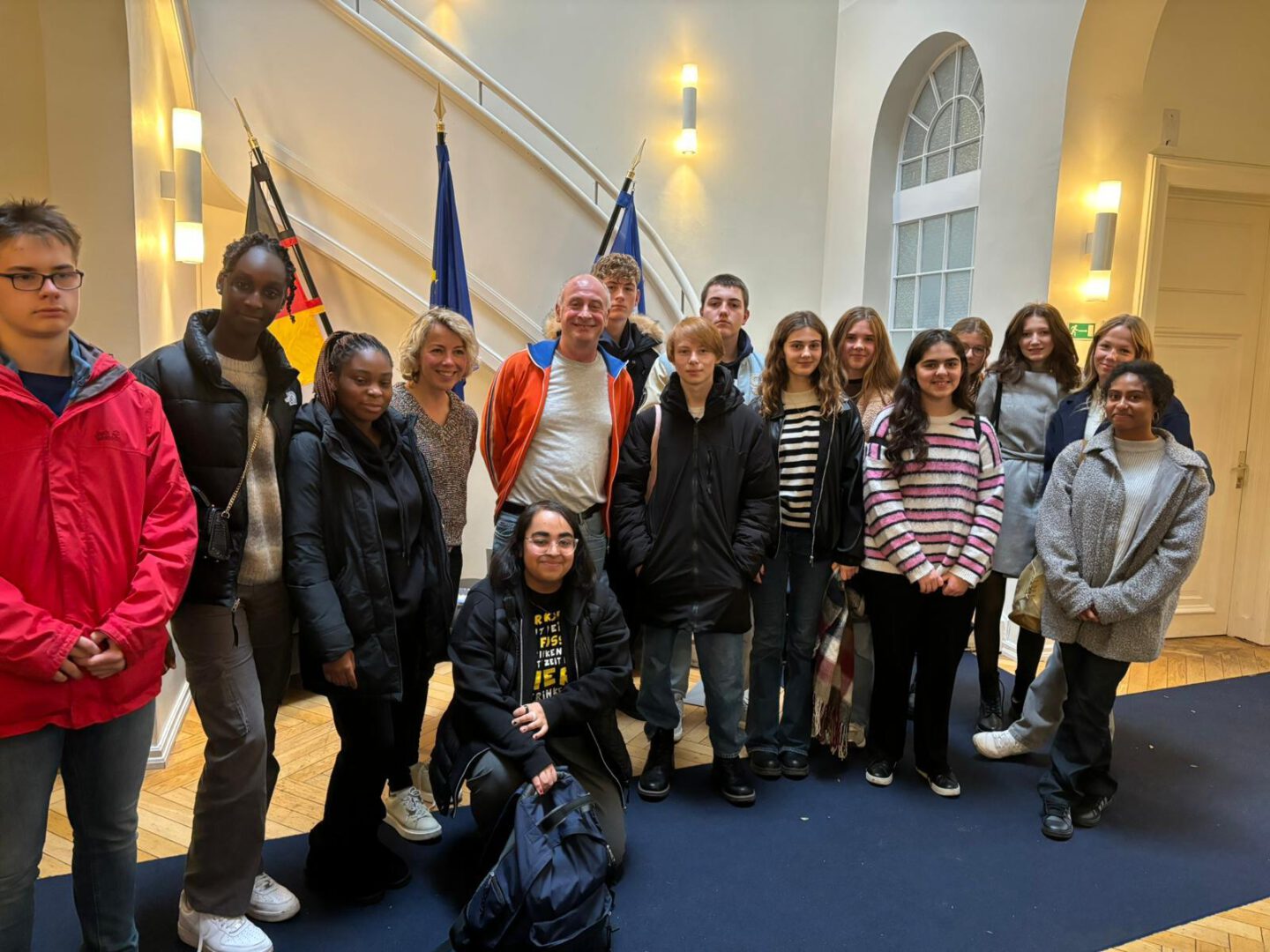 „War meine Großmutter eine Heldin?“ fragt Alfons die interessierte Schülerschaft, die an diesem 8. November ins institut français gekommen war, um mit ihm über dieses Stück zu sprechen. Seine „grand–mère“ hat ihren jüdischen Schwiegervater, der während der deutschen Besatzungszeit in Paris verhaftet worden war, ohne zu zögern nach Auschwitz freiwillig begleitet. Die Schüler diskutierten mit Alfons kontrovers über die Bedeutung von heldenhaften Gesten eines jeden einzelnen im alltäglichen Leben und „die Bedeutung für die Demokratie einzustehen in unseren sehr unsicheren Zeiten“, wie Alfons sich ausdrückte. Zum Schluss der rund einstündigen, lebhaften Diskussionsrunde gab es genügend Zeit für Selfies und Alfons vereinbarte noch mit den Schülern, dass sie in genau 10 Jahren, am 8. November 2033 eine E-Mail an ihn schreiben, um ihm zu berichten, wie es ihnen geht und ob ihre Träume und Pläne in Erfüllung gegangen sind.
