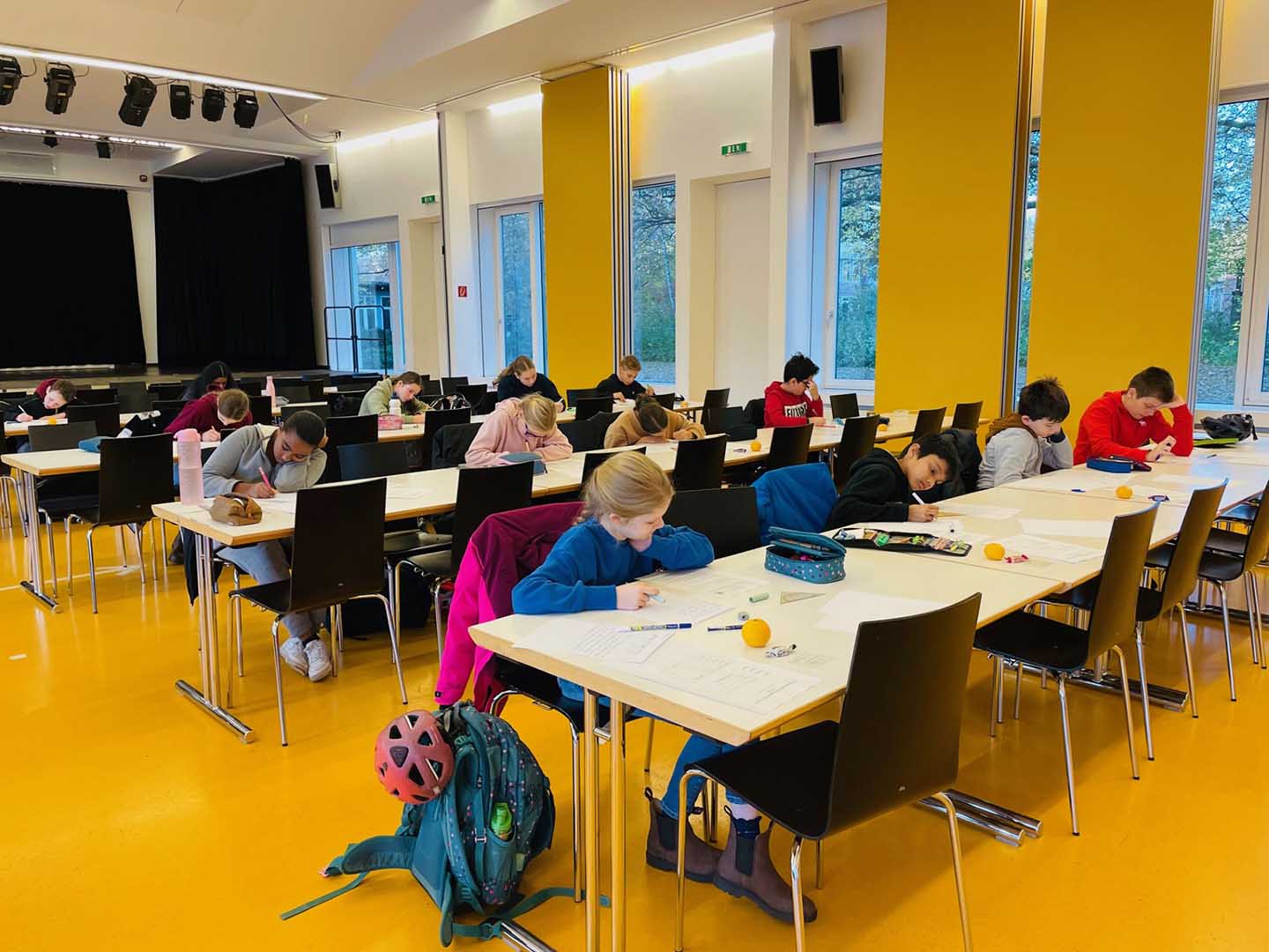 In diesem Jahr gab es sogar ein Novum: Da es aufgrund einer Krankheitswelle Schwierigkeiten mit der fünfstündigen Aufsicht gab, sprangen zwei (ebenfalls mathebegeisterte) Abiturient:innen ein und lösten die Fachvertreterin Frau Reif in der Mensa für zwei Stunden ab. Auch sie waren überrascht über die hohe Konzentration, die in dem Raum herrschte.