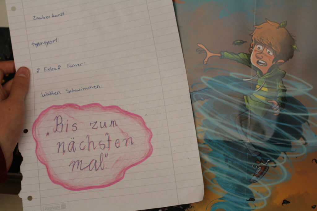 Aber heute war sie mit ihrem neuen Kinderbuch zum Kurs “Abenteuer Bibliothek Klasse 5” eingeladen und das Goethe-Gymnasium verwandelte sich in Kürze in eine Zauberschule- nämlich die der mittelguten Zauberer, die den Weg zum Meister noch vor sich haben und Fächer wie Seherkunde, Zuckerwattensport und Mitteldeutsch belegen (Vorschlag von Naisha).