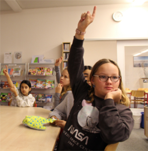 Donnerstag, den 23. November 2023: Während es draußen schüttete, freuten sich die Fans der “Forschungsgruppe Erbsensuppe”-Autorin sehr, Rieke Patwardhan persönlich zum kurzen Plausch in der Bibliothek kennen lernen zu dürfen. Aber heute war sie mit ihrem neuen Kinderbuch zum Kurs “Abenteuer Bibliothek Klasse 5” eingeladen und das Goethe-Gymnasium verwandelte sich in Kürze in eine Zauberschule- nämlich die der mittelguten Zauberer, die den Weg zum Meister noch vor sich haben und Fächer wie Seherkunde, Zuckerwattensport und Mitteldeutsch belegen (Vorschlag von Naisha). Viel, viel zu schnell ging die Zeit vorbei und so wünscht sich nicht nur Sito, dass Frau Patwardhan vielleicht nächste Woche wieder zu uns kommen darf!