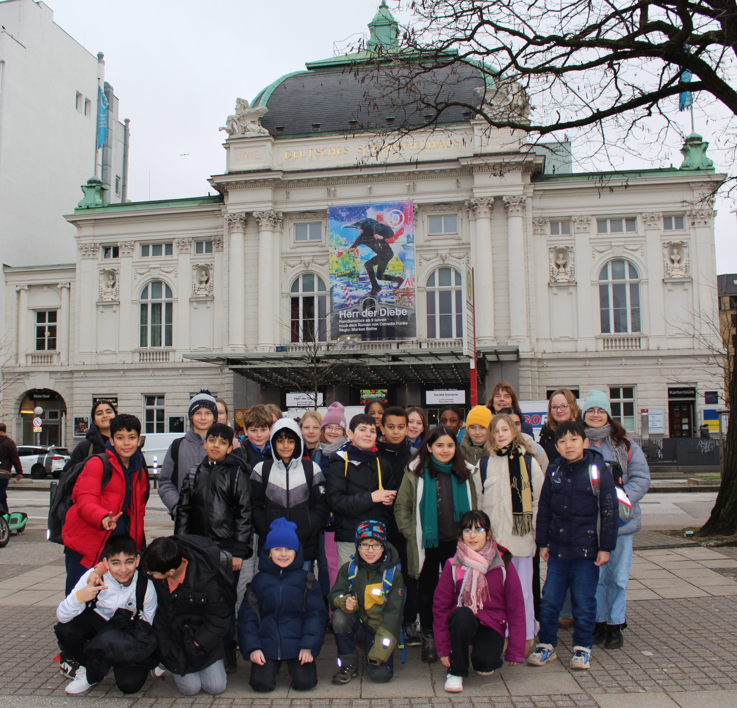 Donnerstag, den 14. Dezember 2023: Mit der brandneuen Linie S5 ging es für uns, die Klasse 5c von Frau Ohnesorge und Frau Reif, zum Schauspielhaus in St. Georg. Dort wird nämlich gerade als Weihnachtsmärchen Cornelia Funkes “Der Herr der Diebe” gespielt – und das mit echter Wasserkulisse. Schauplatz ist nämlich Venedig. Wir wollen jetzt hier an dieser Stelle nichts von der Handlung verraten, da das Buch ja auf der Leseliste Klasse 5/6 steht- nur soviel sei gesagt: Das Stück bringt unglaublich gute Laune mit großartigen Witzen, klasse Musik und tollen Kostümen.