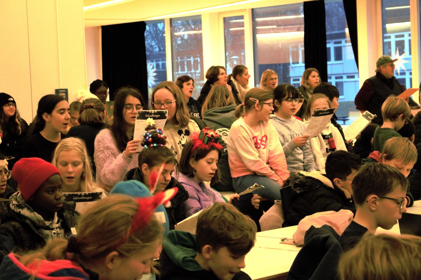 Donnerstag, den 21. Dezember 2023: Spätestens nach dem Weihnachtskonzert versteckten sich in nahezu jedem Winkel des Schulgeländes alljährliche Ohrwürmer. In diesem Jahr hat die Musikfachschaft am letzten Tag vor den Weihnachtsferien zum ersten Mal zum Adventssingen aufgerufen, auf das sich bereits die gesamte Lehrer- und Schülerschaft gefreut hatte. Bedingt durch die Wetterlage kamen diesmal leider nur die Jahrgänge 5 und 6 in den Genuss, im Forum bei feierlich-fröhlicher Stimmung Klassiker wie “Hört der Engel helle Lieder”, “Stille Nacht”, “Jingle Bells”, “Rudolph The Red-Nosed Reindeer”, “Last Christmas” und “Feliz Navidad” gemeinsam anzustimmen. Dennoch war es ein gelungener Ferienauftakt, der für viel Freude und Weihnachtsstimmung sorgte!
