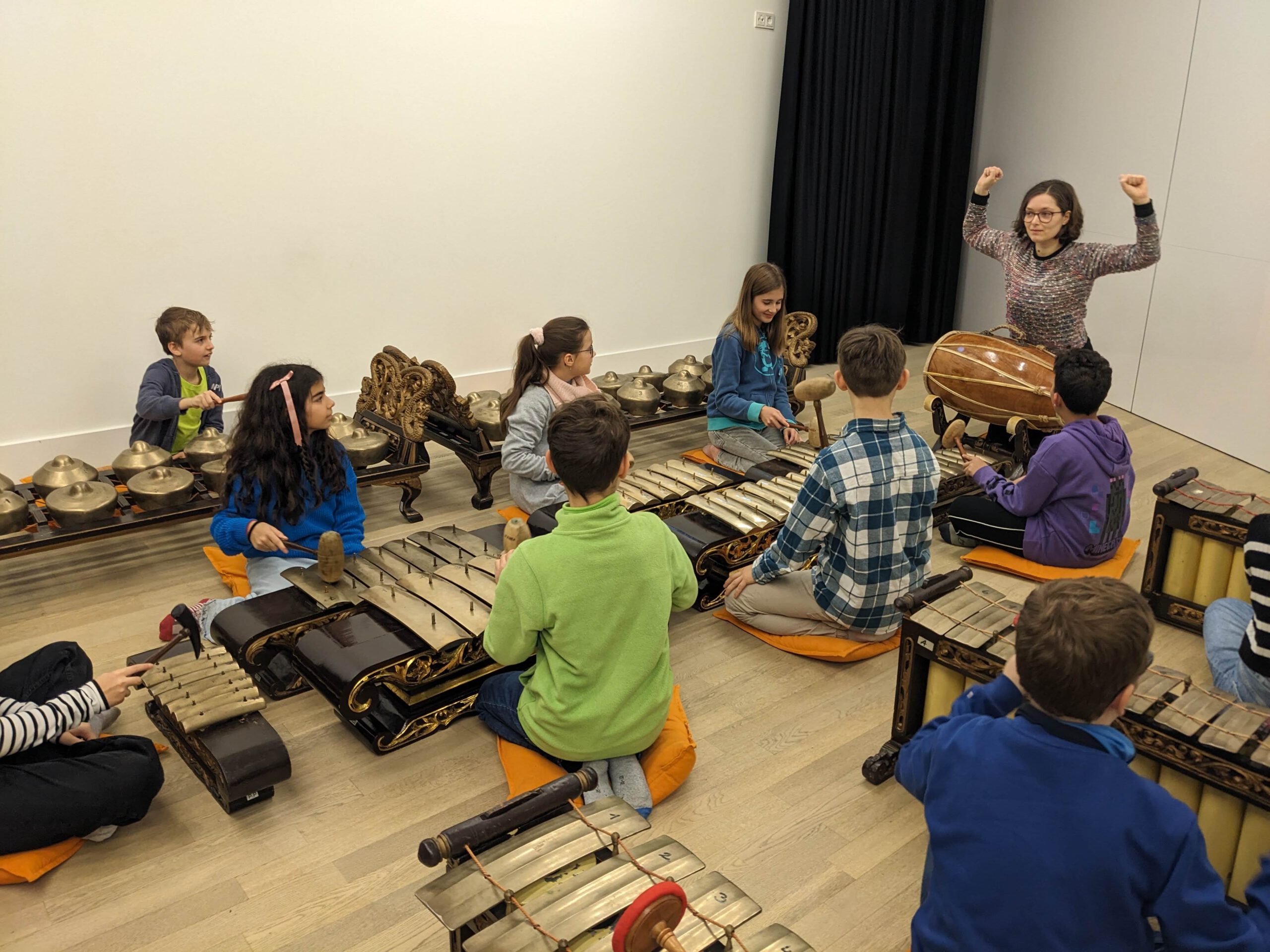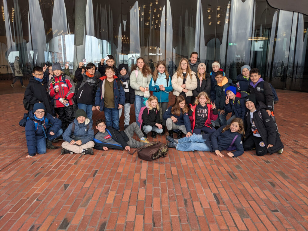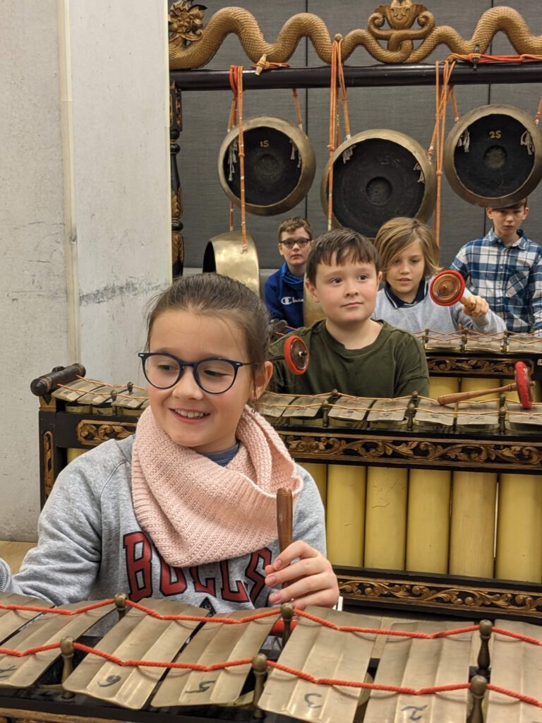 Montag, den 11. Dezember 2023: Die 5b ist zur Elbphilharmonie gefahren, um in einem Workshop in die Welt der Gamelan-Musik einzutauchen. Gamelan-Musik stammt von den Inseln Bali und Java – wir durften mit Gongs und Metallofonen Stücke erfinden und spielen. Es entstanden ungewöhnliche Klänge und alle hatten großen Spaß dabei. Zum Schluss besichtigten wir die Plaza der Elphi – der Ausblick auf Hamburg war sehr schön!