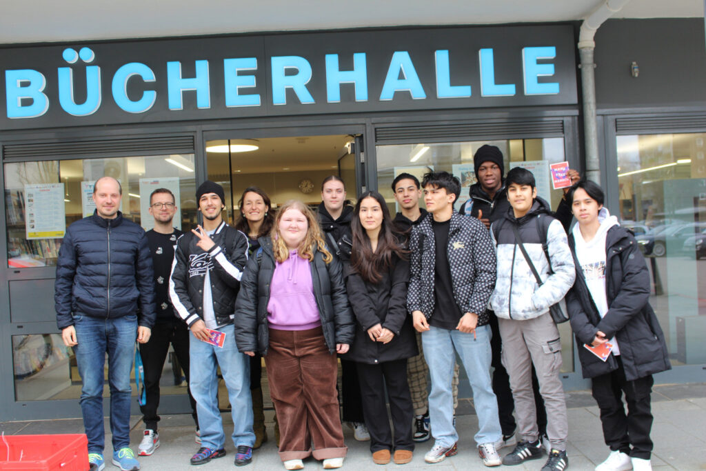 Mittwoch, den 31. Januar 2024: Unsere IVKa hatte heute etwas ganz besonderes vor- Raus aus Lurup und auf in unseren Nachbarstadtteil in die schöne Bücherhalle des Leiters Jens Ambachers, der uns literarisch im Pullover mit Grinsekatzenmotiv willkommen hieß. Der Autor hatte sich in der Strecke von Billstetd nach Osdorf etwas in der Länge unterschätzt, die er dafür mit seinem E-Auto benötigte. Das war gar nicht schlimm, denn so konnten wir noch gemütlich mit unserer Lehrerin Frau Baumeister unsere Pausenbrote zum Frühstück genießen, Dann durften wir Herrn Bernady alle unsere Fragen stellen. Egal, ob es um so weltliche Dinge wie sein Alter ging oder die Begrifflickeit von Glück und Sinn im Leben. Frau Baumeister sagte zum Abschied: “Wir sind alle beflügelt und nehmen ganz viel von diesem vormittäglichen Diskurs mit.”
