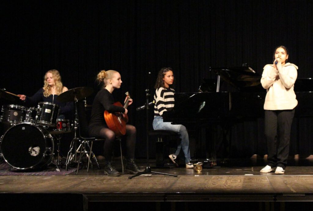 Donnerstag, den 22. Februar 2024: Should I stay or should I go? Diese Frage ging einigen Bühnenstars anfangs durch den Kopf, aber sicherlich nicht den Musikbegeisterten, die sich am Donnerstag, den 22. Februar 2024 in das Forum des Goethe-Gymnasiums einfanden. Zwölf Solist:innen und Ensembles hatten all ihren Mut zusammengenommen und waren dem Aufruf der Musikfachschaft gefolgt. Dann war der große Abend da: Starke Soloauftritte von kleinen und großen Pianist:innen stimmten mit Abbas Dancing Queen, Tetzels Präludium und Billie Eilishs Bondhit No Time To Die auf die lauten Töne der Rockbands und die Stimmgewalt der Sänger:innen ein. Neben Nirvanas Smells Like Teen Spirit brachten insgesamt vier Gesangssolistinnen ihre eigenen Versionen der einstudierten Songs mit Bravour auf die Bühne. Zu hören war u.a. Hayat Bayram Olsa, ein türkisches Musikstück, welches von der Siebtklässlerin Kübra selbstbewusst vortragen wurde. Besonders vermissen werden wir Joana (Killing Me Softly) und Alma (Hopelessly Devoted To You) aus dem diesjährigen Abiturjahrgang, die an diesem Abend auch außerhalb der Schulensembles ihr professionelles Gesangstalent unter Beweis stellten. Sechs Mädchen aus der 8b präsentierten stolz ihre bemerkenswerte Eigenkomposition in der klassischen Bandbesetzung, während die frisch formierte Schülerband bereits nach wenigen Wochen eine tolle Show liefern konnte! Zarte Klänge von Yiruma auf der Querflöte (Helene aus der 10b) und von Beethoven auf der Geige (Anna aus dem S4-Musikprofil) ertönten unter Klavierbegleitung und sorgten – genauso wie die anderen Beiträge des Abends – für viel Applaus und Begeisterung. Souverän und ganz bezaubernd führten Jasmina (Kl. 6b) und Lian (Kl. 5b) das Publikum durch den Abend und machten am Ende richtig Lust auf die kommenden Musikveranstaltungen im Mai und Juni. Damit nicht genug: Im Vorraum präsentierten Schüler:innen des S2-Kunstprofils voller Stolz ihre beeindruckende Fotoreihe zum Thema Mikroplastik. Vor und nach den musikalischen Beiträgen gaben die Künstler:innen außerdem spannende Einblicke in ihr Fotoprojekt. Das war ein gelungener Kunst- und Musikabend – und sicherlich nicht der letzte!