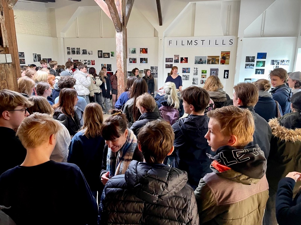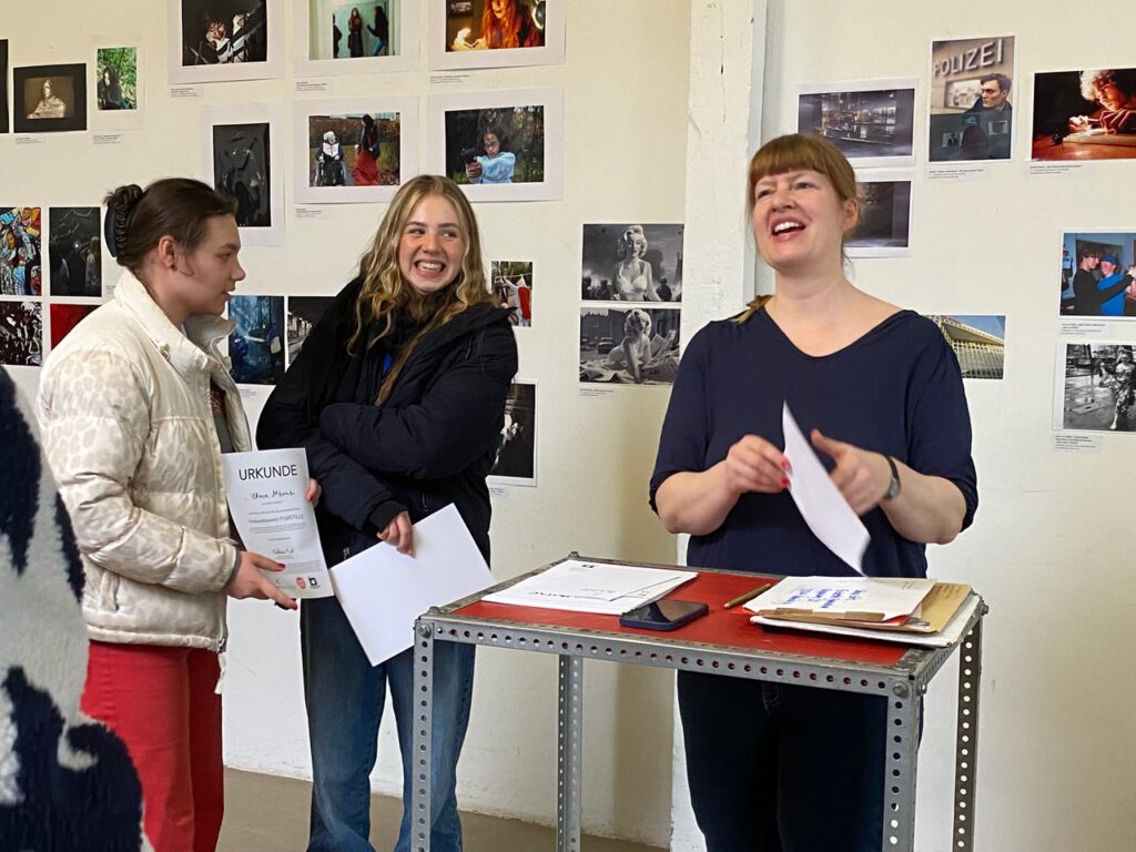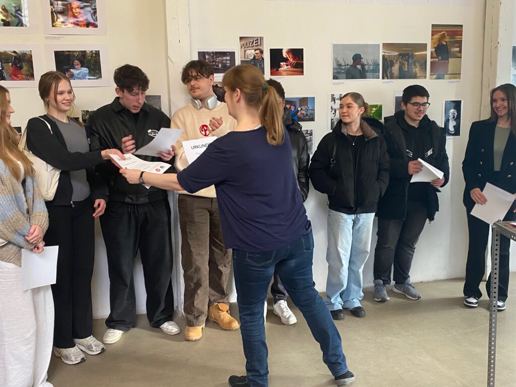 Am 12. März war es dann so weit: in zwei Schichten mit jeweils fast 200 Gästen wurden die Ausstellung in der Fotofabrique im Gängeviertel eröffnet. Als Anerkennung für ihre herausragende Leistung erhielten alle Teilnehmer:innen mit ihren Kunstlehrer:innen während der Vernissage eine Urkunde von Frau Götz überreicht. Darunter waren auch acht Schülerinnen aus dem 11. Jahrgang des Goethe-Gymnasiums: Herzlichen Glückwunsch!