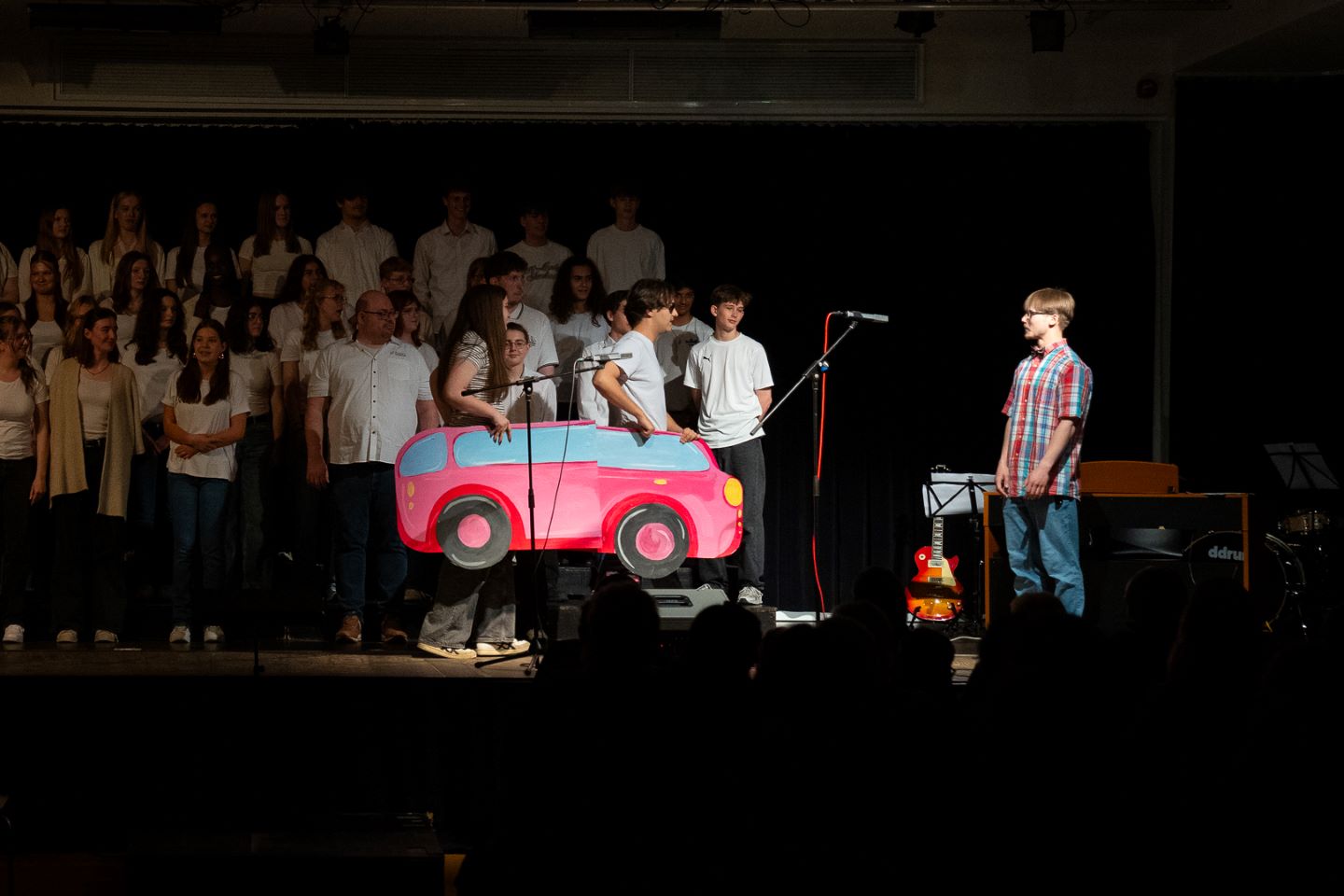Montag, den 03. Juni 2024: Glück gehabt, wer den Weg ins Forum des Goethe-Gymnasiums gefunden hatte! Gefühlvoll, ausdrucksstark, stimmsicher und mit viel musikalischem Talent zeigten sich der Große Chor unter der Leitung von Anna Beilner und Marilena Günther-Voit und der Glee-Club unter der Leitung von Tine Wiechmann an diesem Abend mit einem Potpourri aus Hits der letzten Jahrzehnte. Dabei stand an diesem Abend neben der großen Freude am Singen auch die Freude am Leben im Rampenlicht. Eingebettet wurden die einstudierten Musikstücke in lebensnahe Theaterszenen, die von einer kleinen Gruppe von Abiturient:innen in Eigenregie entworfen und voller Leidenschaft auf der Bühne dargestellt wurden. Die Projektgruppe um Alma Bahr als überzeugende Omi sowie Maja Domann, Jonas Kempe, Elisabet Milencuk und Ivan Sulimov als junge Erwachsene, die allesamt auf der Suche nach ihrem eigenen Glück waren, brachte Themen, die sie derzeit bewegen, authentisch auf die Bühne. Dabei stellten die Hauptdarsteller:innen ihr schauspielerisches Können Szene für Szene unter Beweis. Nachdem die Protagonist:innen ihre individuellen Lebenskrisen den Konzertgästen eröffnet hatten, wurden sie vom Glee-Club eindringlich und energiegeladen zum Davonlaufen („Lauf Davon“ von Danger Dan) animiert. Mithilfe einer bemerkenswerten Performance von Billy Joels Song „And So It Goes“ versuchte die Gruppe von Menschen, die sich daraufhin auf einen Roadtrip begab, mit der Vergangenheit abzuschließen und „Another Chapter“ (Arielle Jacobs), eindrucksvoll von Luisa Schröder arrangiert und vorgetragen, einzulegen. Für gute Laune und strahlende Gesichter sorgte auf der Rundreise der mitreißende Chorauftritt zu „I Get Around“ (The Beach Boys) und „When We Were Young“ (Adele). Zum Träumen brachte der Glee-Club in Begleitung von Bert Becker an der Gitarre und Carlotta Knorr an der Querflöte mit „California Dreaming“ (The Mamas and the Papas), bevor die weiblichen Gesangsstimmen des Großen Chores mit „Sunny“ (Bobby Hebb) die Stimmung vor der Pause nochmal anhoben. „Radioactive“ (Imagine Dragons), klang- und kraftvoll vom Glee-Club dargeboten, fühlte sich die Reisegruppe nach der Autopanne während des Roadtrips. Als dieses Hindernis schließlich überwunden werden konnte, entschlossen sich die jungen Erwachsenen dazu, ihren eigenen Weg zu gehen. Klangliche und inhaltliche Tiefe brachten die Tenor- und Bassstimmen des Großen Chores mit Frank Sinatras „My Way“. Am Ende dreht sich im Leben nicht, wie anfangs vom Großen Chor gesungen, alles nur um „Money Money Money“ (ABBA), denn jede Person hat eine eigene Definition von Glück und das Glück in der eigenen Hand. Das stimmgewaltige Finale des Großen Chores verdeutlichte mit Elton Johns „I‘m Still Standing“ diese aufbauende Botschaft und entließ das begeisterte Publikum mit viel musikalischem Sonnenschein und einer Reihe von Ohrwürmern.