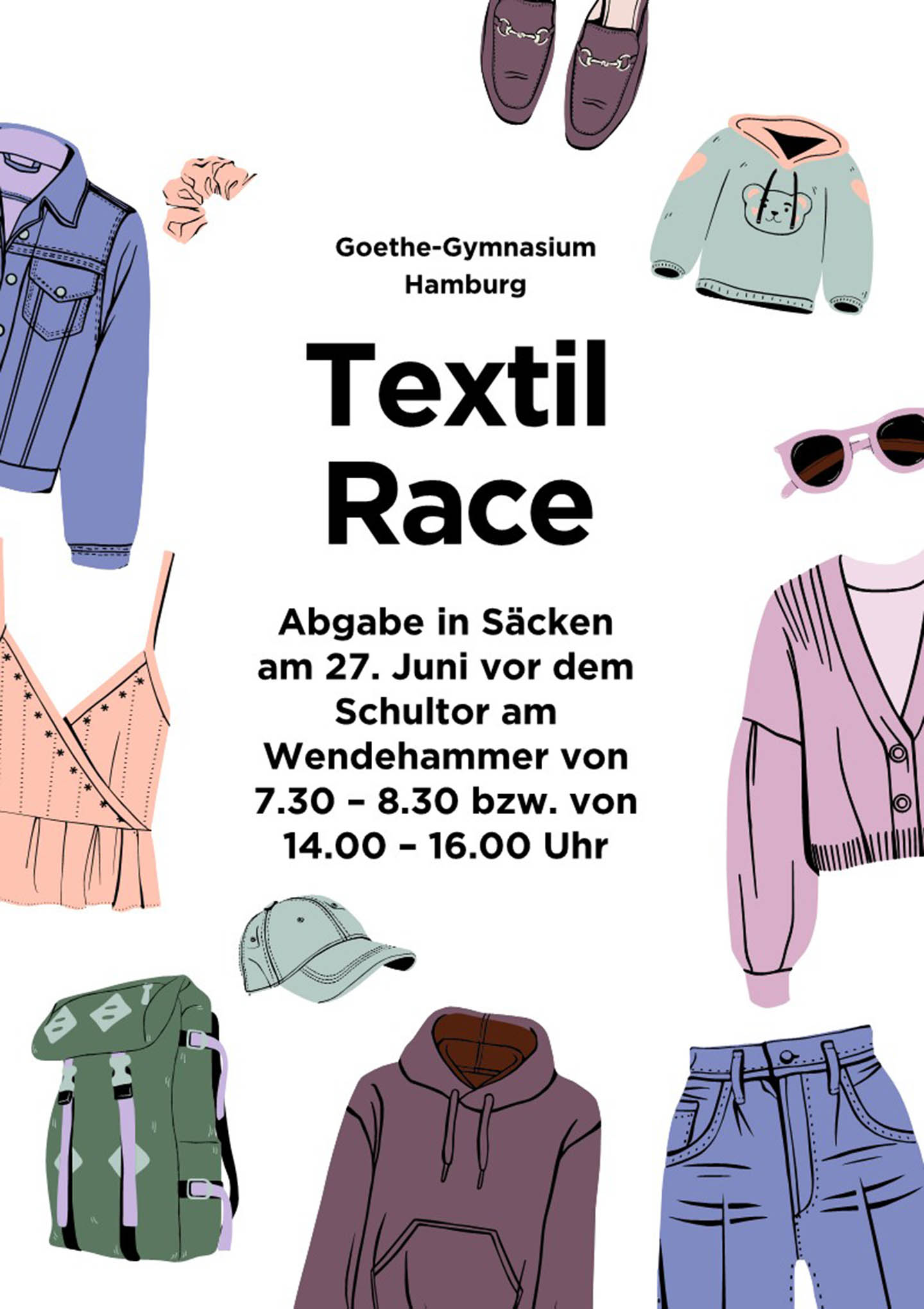 Schüler:innen unserer 7. Klassen nehmen in diesem Jahr am Textil-Race teil, das von der gemeinnützigen Initiative www.das-macht-schule.net organisiert wird. Wir sammeln Alttextilien im Wettbewerb mit anderen Schulen. Denn fast alles kann weitergegeben, repariert oder recycelt werden. Wir werden auch eine Kleiderbörse ausrichten, um noch gut erhaltene Kleidungsstücke zu tauschen oder weiterzugeben.