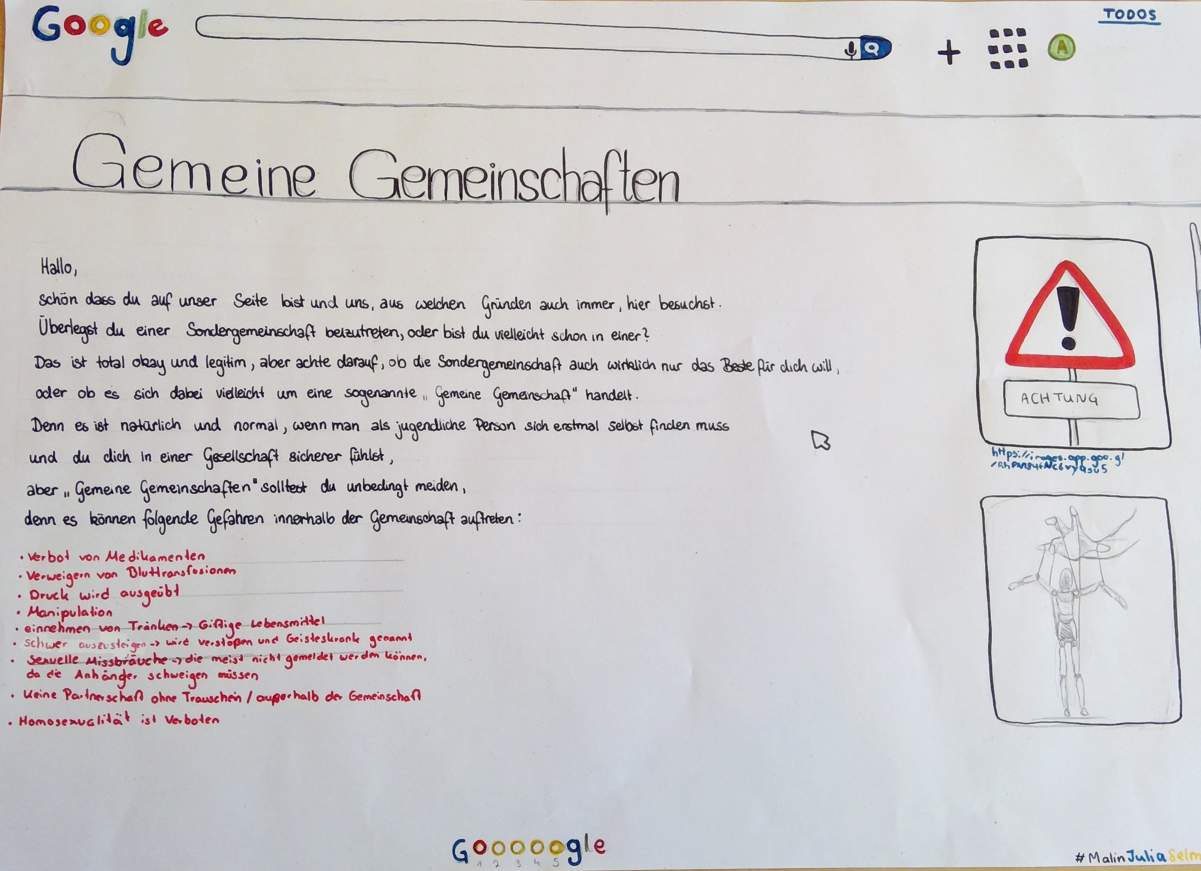 Im Philosophieunterricht der achten Klasse haben wir uns mit Sondergemeinschaften (Sekten) beschäftigt und gelernt, dass nicht jede Sondergemeinschaft abzulehnen ist und es dennoch in manchen dieser Gemeinschaften ,,gefährliche” Hintergründe geben kann. Deshalb nennen wir diese Gemeinschaften auch Sondergemeinschaften und nicht Sekten, da der Begriff ,,Sekte” meistens mit negativer Bedeutung belegt ist. Wir haben dieses Thema im Unterricht bearbeitet, da viele Jugendliche in unserem Alter Themen beschäftigen, die Sondergemeinschaften aufgreifen. Gründe für den Beitritt in eine Sondergemeinschaft können sein, dass man zum Beispiel in der Familie wenig Anschluss findet und daher den Anschluss in einer festen Gruppe sucht. Um auf Gefahren in Sondergemeinschaften hinzuweisen, haben wir recherchiert und Plakate mit Informationen gestaltet.