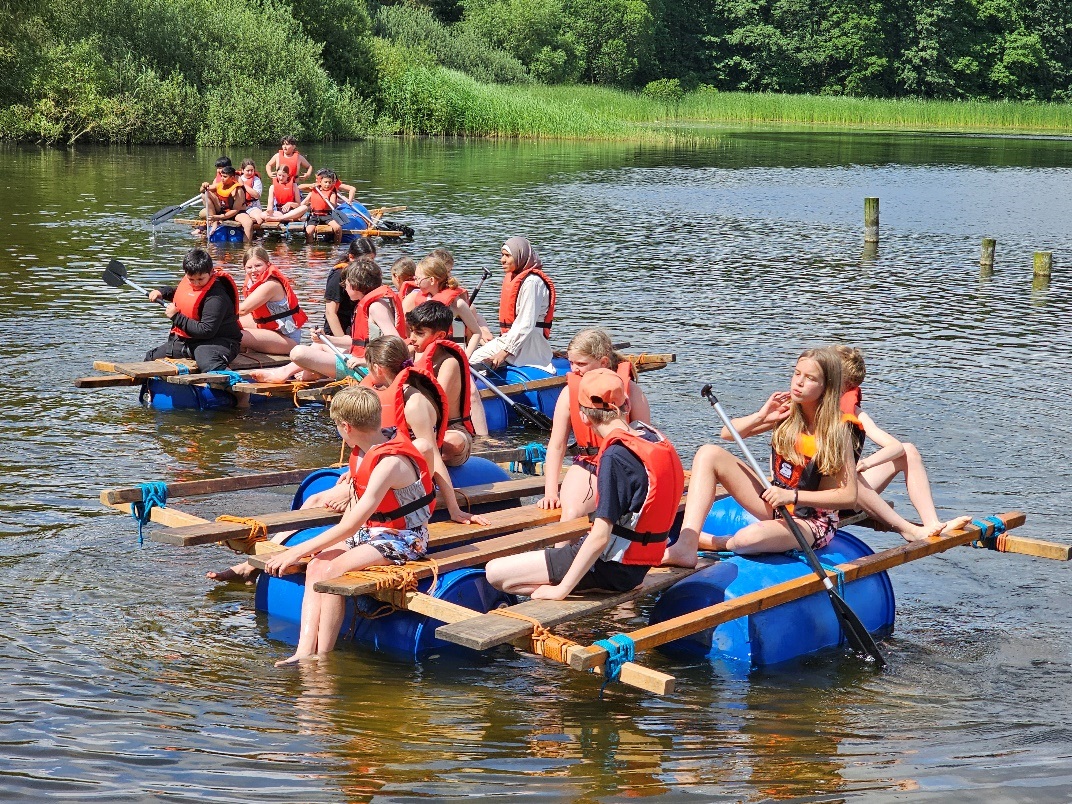 Als wir dann zum See losgegangen sind, hat es ein bisschen geregnet, aber das hat uns nicht gestört. Nach einer Weile hat es auch aufgehört. Als wir angekommen sind, haben die Gruppen das Material bekommen. Wir haben 4 schmale Hölzer, 4 breite Hölzer und 4 Fässer bekommen. In den Gruppen wurde ein bisschen hin und her diskutiert, aber irgendwann haben sich alle auf eine Idee geeinigt. Vicki und Sandra haben uns Seile gegeben und verschiedene Knoten gezeigt, damit die Flöße nicht auseinanderfallen. Dann war auch schon Mittagspause. Einige Kinder hatten ihre Lunchbox aber schon aufgegessen, weil wir dachten, es gäbe Pommes am Imbiss. Da es kein Personal am Imbiss gab, gab es leider auch keine Pommes. Frau Haddorp war aber so nett und hat uns im Nachbarort Eis gekauft und für die Kinder, die besonders viel Hunger hatten, ein Baguette.