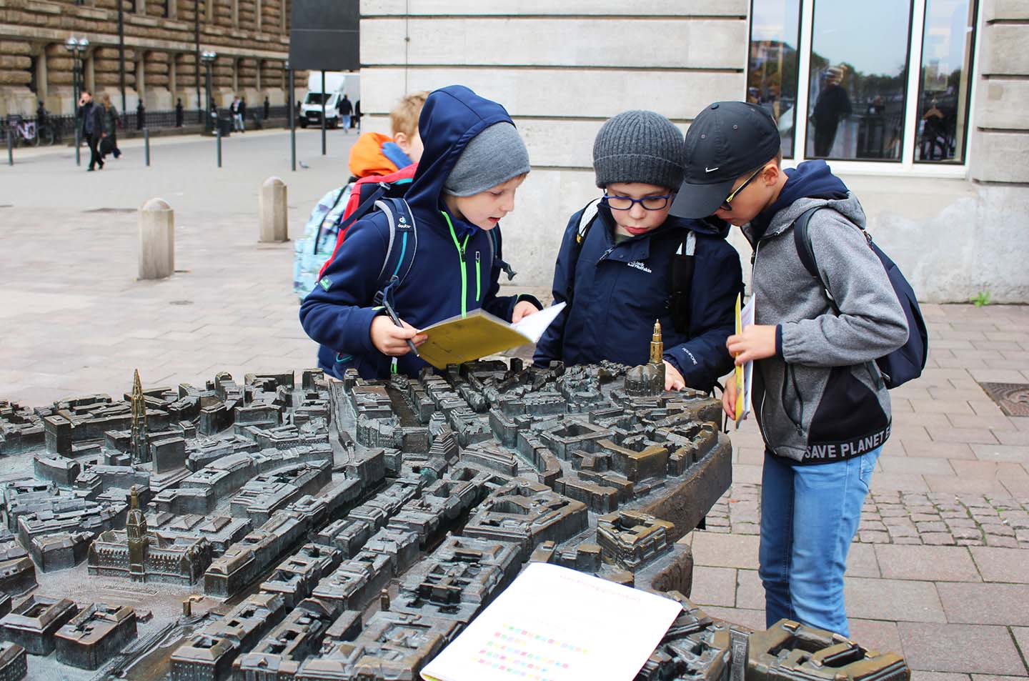 Montag, den 14. Oktober: Die Klasse 5e mit Frau Jäger hingegen waren im Vergleich dazu als Jungdetektive ganz irdisch unterwegs- nämlich auf den Straßen rund um das Hamburger Rathaus in der Innenstadt und stellten uns den kniffligen Fragen der ULF-Rallye, die wir zuvor in der Buchhandlung der Rathauspassage abgeholt hatten. So ging es im Team “Bibliothek” für Kasimir, Enis, Julian, Paul und mir erstmal über die Schleuse vom Alten Wall über den Brunnen im Innenhof des Rathauses zum Domplatz. Wir hätten sicherlich auch gewonnen, wäre Julian beim Rennen nicht mitten auf dem Rathausplatz umgeknickt. So ergriff unsere Teamleaderin Frau Schramm gleich Erste-Hilfe-Maßnahmen (ein Schokobonbon linderte den Schmerz erheblich) und vergaß in diesem Zuge ihren Rucksack wieder anzuziehen. Dies fiel uns aber erst auf der Höhe des berühmten Café Paris auf. So mussten wir rasch zurück und fragten die netten Polizeibeamten des Rathauskommissariats, die den Rucksack zum Glück gesichert hatten und blieben Gewinner im Herzen!
