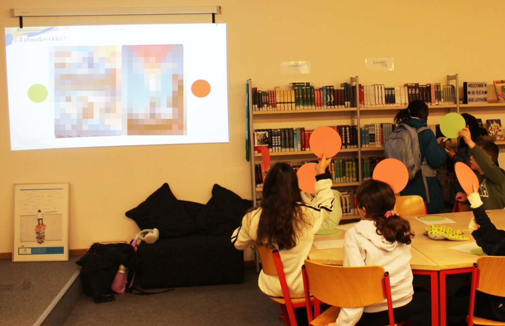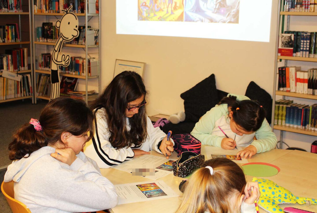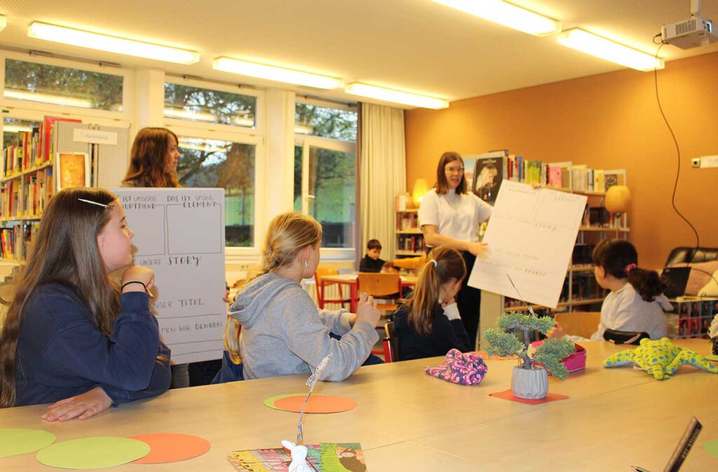 Donnerstag, den 7. November 2024: Keine Sorgen- es ist kein gruseliges Revival, sondern die neue Buchtitelidee einer unserer vier Gruppen, die sich im Kurs Abenteuer Bibliothek Klasse 5 rund um die geladenen Gäste vom Kinderbuchverlag Oetinger gebildet haben. Wir dürfen nämlich unser eigenes Storyboard entwerfen, in dem wir unseren ganz persönlich kreierten Helden nicht nur eigene Namen und Eigenschaften verleihen, sondern sie auch ganz klar mit den Kräften der vier Elemente ausstatten können. Ganz vielen Dank an Jil und Olena, die uns die verschiedensten Covervorschläge gezeigt haben. zu denen wir unser Voting abgeben konnten. Gekrönt wurde das zum Schluss mit dem musikalischen Soundtrack zu unserem eigenen Roman. Was für ein schöner Nachmittag!