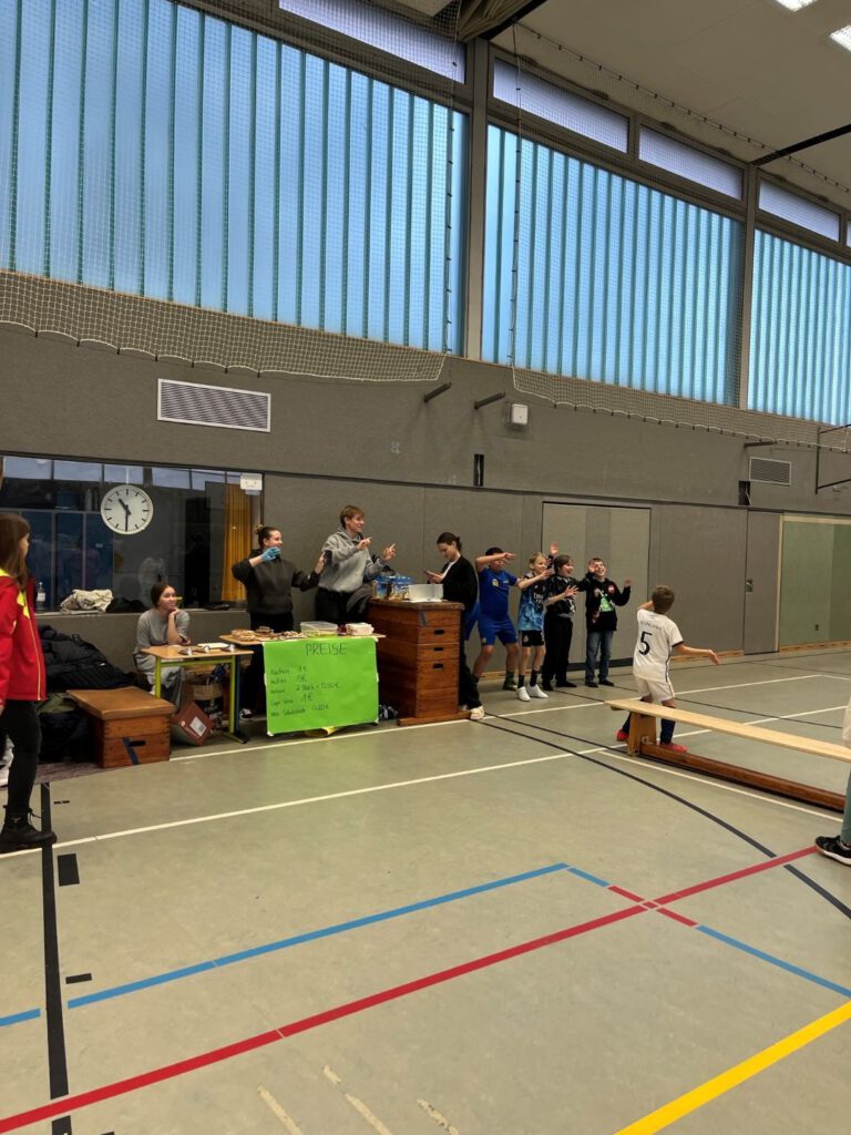 In der kleinen Halle gab es unterschiedliche Miniwettkämpfe. Zum Beispiel: wer am längsten an einer Reckstange hängen kann, er die meisten Körbe von 10 Versuchen schafft, wer den weitesten Standweitsprung hat, wer am längsten Wandsitzen kann.