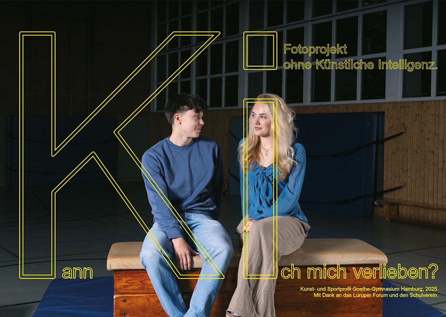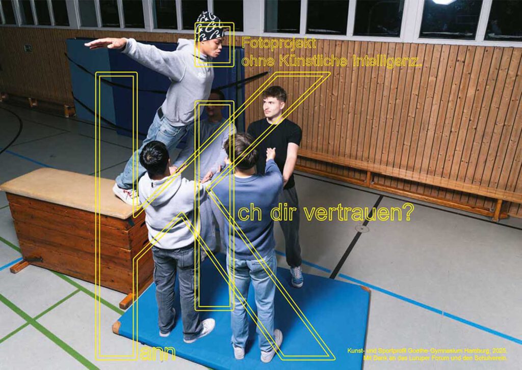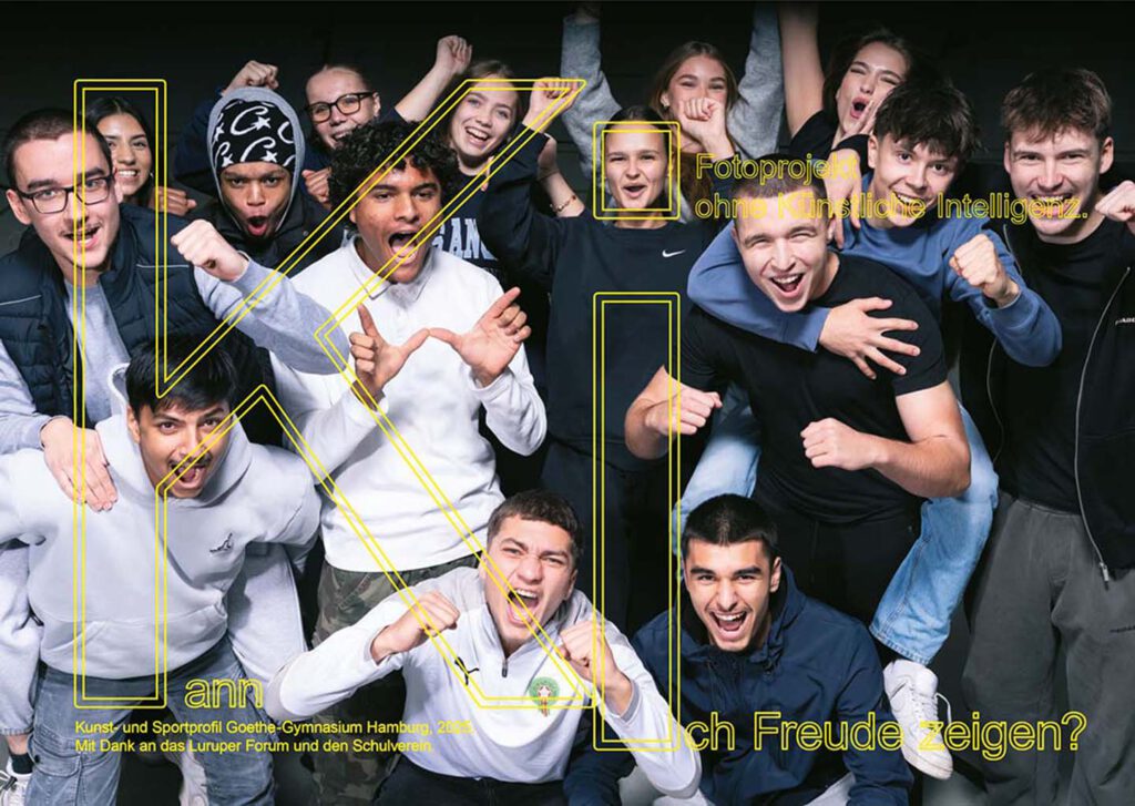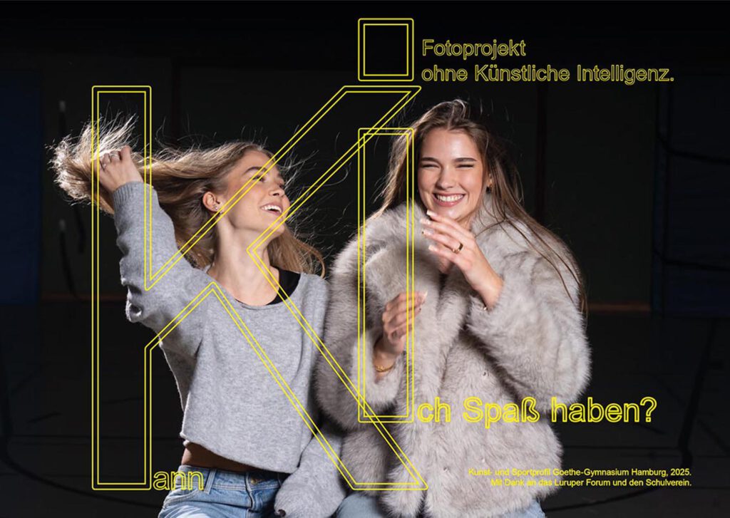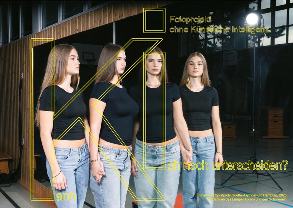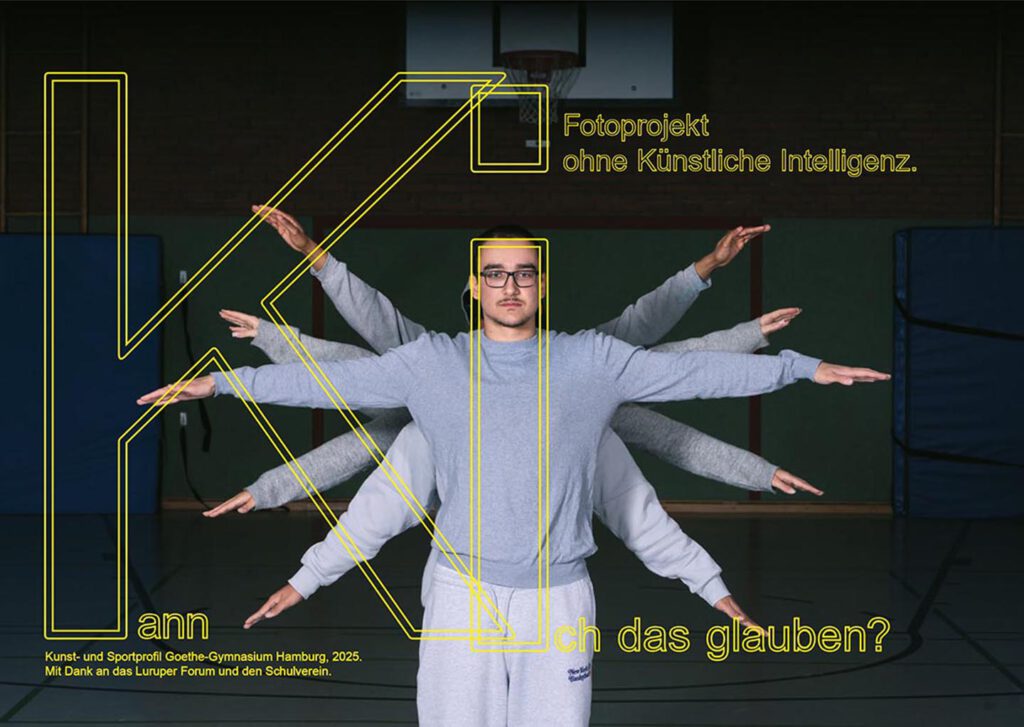 In einer zunehmend digitalisierten Welt, in der Künstliche Intelligenz (KI) in immer mehr Bereiche unseres Lebens eingreift, haben wir als Kunstprofil zusammen mit dem Sportprofil eine Plakatserie produziert, in der wir die KI kritisch betrachten. Unter dem Motto „Kann Ich …“ haben wir den Fokus daraufgelegt, was die KI (noch) nicht kann.