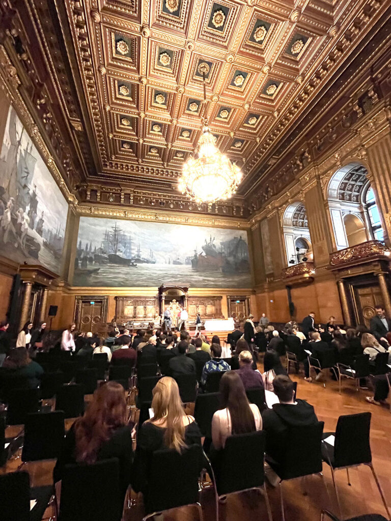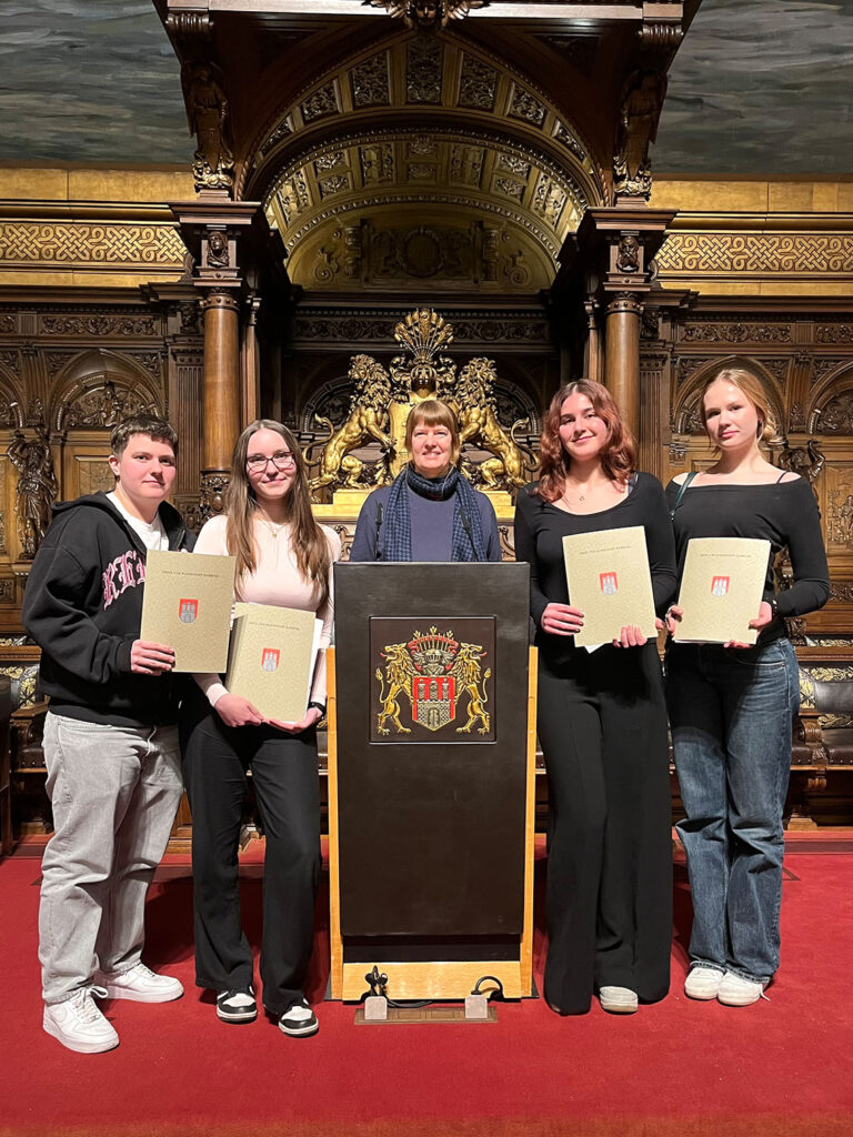 Am Freitag, den 24. Januar war „Ruhm und Ehre“ Inhalt des Kunstunterrichts. Auf gings zum außerschulischen Lernort „Hamburger Rathaus“, wo vier Delegierte des Kunstprofils von Frau Götz feierlich Urkunden überreicht wurden – vom Staatsrat Rainer Schulz persönlich! Bei den Ehrungen im großen Saal des Rathauses mit musikalischer Begleitung und der Moderation von Thomas Bressau (Referent für Schülerwettbewerbe) ist der Kunstbereich des Goethe-Gymnasiums Stammgast. Eingeladen werden Preisträger:innen von Wettbewerben für Hamburger Schulen aus sämtlichen Sparten wie Sport, Musik oder Naturwissenschaften. In den letzten Jahren waren Fotografieprojekte aus dem Kunstunterricht besonders erfolgreich: etwa beim Europäischen Wettbewerb auf Bundesebene oder beim Deutschen Jugendfotopreis, der gleich doppelt ans Goethe-Gymnasium geholt wurde. Herzlichen Glückwunsch und vielen Dank an unser schönes Rathaus, für diesen festlichen Nachmittag!