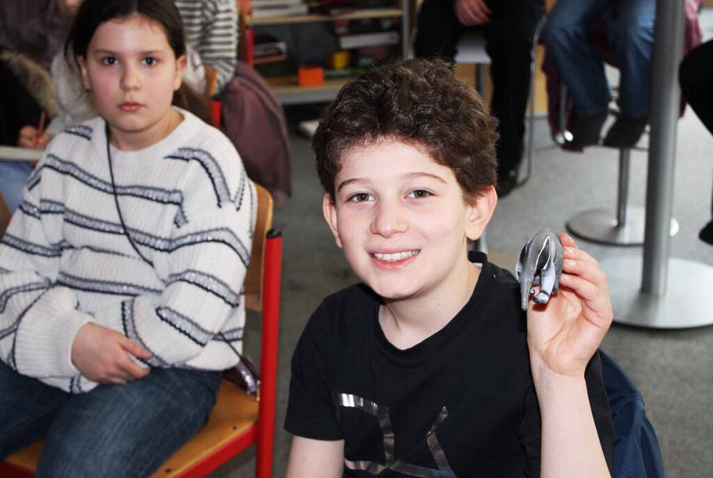 Klassensprecher Yassin (5c) präsentiert GunneltOve mit unserer Bibliothekarin Frau SchrammDie Mädels aus der 5e holen sich AutogrammeZaungäste aus der Klasse 5b sind happy