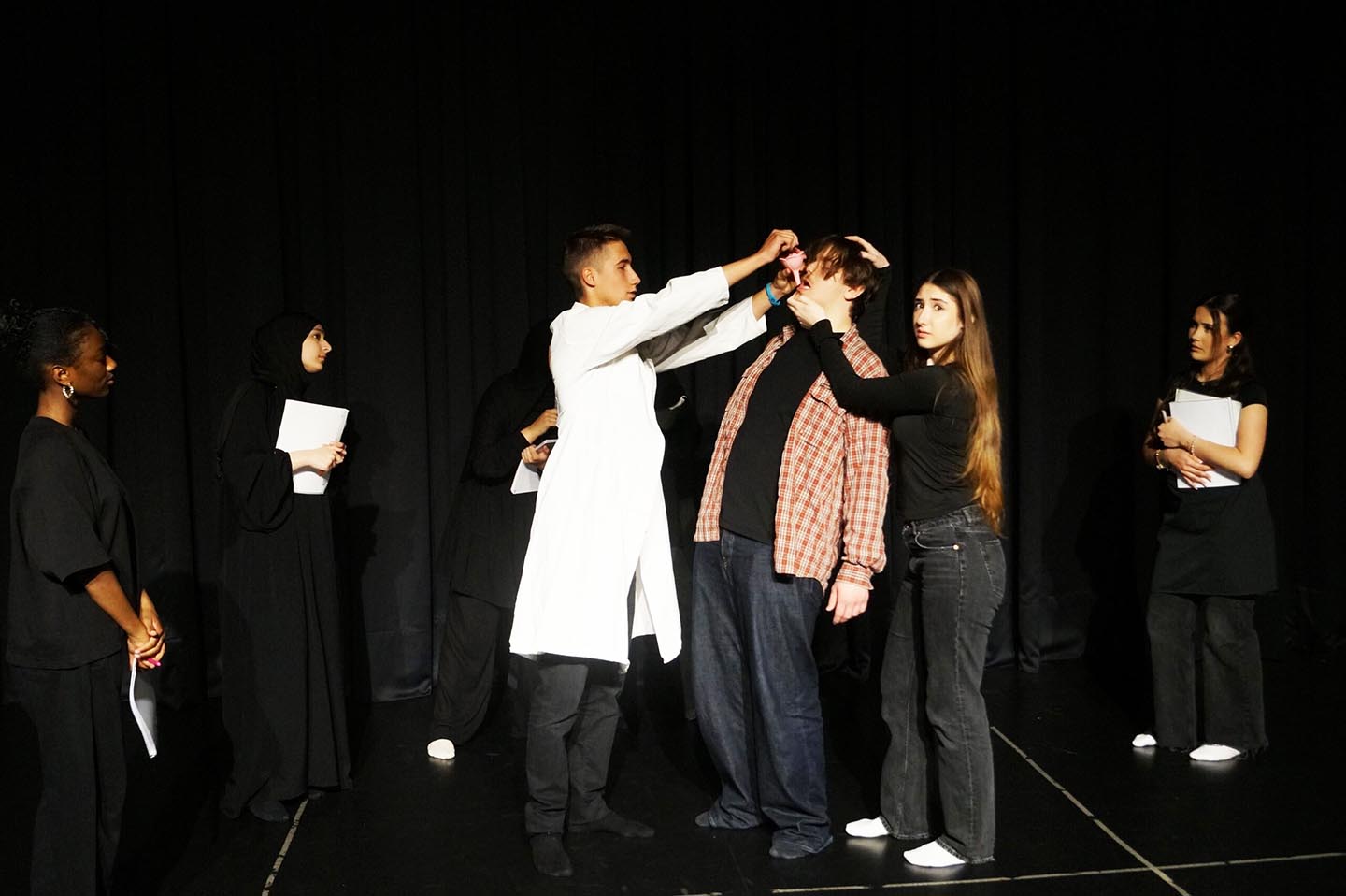 Pünktlich vor der Unterrichtsbefreiung des 4. Semesters zeigte der Theaterkurs des Medienprofils von Frau Lewes am 16. April seine diesjährige Arbeit: Wir haben das Theaterstudio zur Bühne für Woyzeck gemacht, einen liebevollen, gedemütigten, bemühten Mann, der schließlich verrückt wird und Realität nicht mehr von Wahn unterscheiden kann. Wir hatten uns mit dem Dramenfragment „Woyzeck“ von Georg Büchner beschäftigt und uns gefragt, was in Woyzecks Leben dazu beiträgt, dass er durchdreht und schließlich eine Gewalttat an seiner Freundin verübt. Wir luden ihn in unsere heutige Welt ein und vollzogen nach, wie Menschen am gesellschaftlichen Rand probieren, am sozialen Leben teilzunehmen und wie sie gedemütigt werden. Wir empfanden auch Woyzecks Eifersucht, als er sieht, dass seine Freundin fremd geht. Woyzeck wurde für uns ein Bekannter, vielleicht ein Freund, den wir verstehen konnten. Die Schauspielerinnen und Schauspieler gaben alles und fuhren zu Höchstleistungen auf: Es wurde leidenschaftlich gekämpft, geweint, gedemütigt und betrogen – das Publikum hielt manches Mal den Atem an. Die schauspielerisch sehr sehenswerte Leistung wurde entsprechend gebührend gefeiert.
