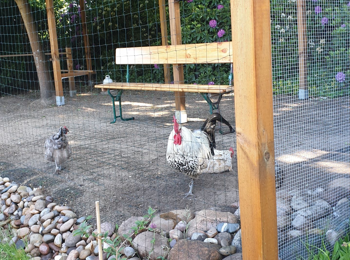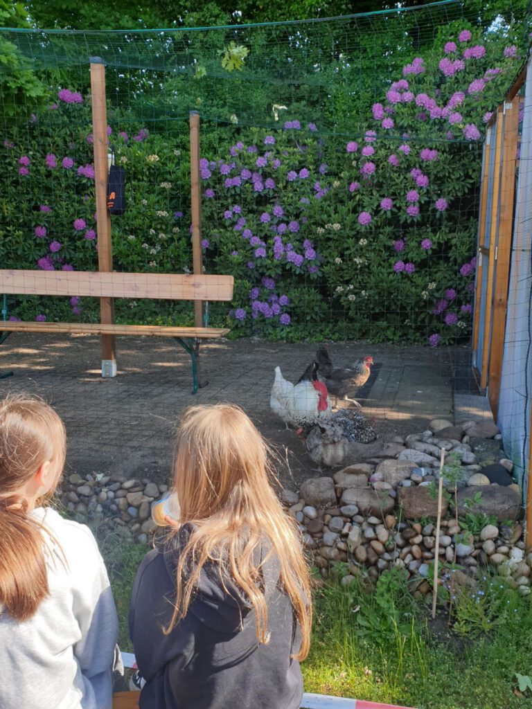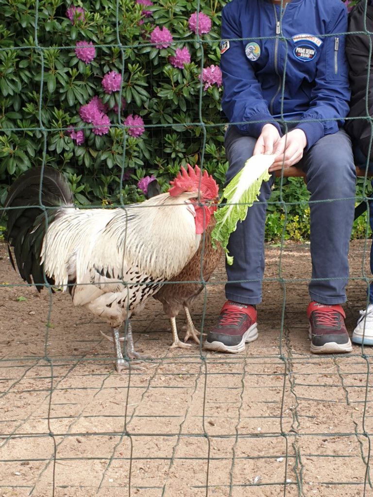Donnerstag, den 22. Mai 2025: Wie ticken Hühner und wie sieht eine artgerechte Haltung dieser aus? Auf all diese Fragen fanden die Kinder der 5e an der Elbgaukirche eine Antwort. Mit einem fröhlichen Gackern und neugierigen Blicken wurde die Klasse von den Gehegebewohner:innen empfangen. In lockerer, verständlicher Sprache gab der Referent Uwe Nissen Einblicke in seinen Alltag mit den Hühnern. Dabei gab er den Schüler:innen viel Gelegenheit ihr Wissen und ihre Fragen einzubringen. Ein großes Highlight des Besuchs war die Möglichkeit, aktiv mit den Tieren in Kontakt zu treten. Unter fachkundiger Aufsicht durften die Kinder die Hühner mit Chinakohl und Mehlwürmern füttern. Ein besonders handzahmes Huhn ließ sich sogar auf den Schoß nehmen und streicheln, was bei den jungen Besucher:innen großen Anklang fand. Wiederum verschaffte sich Hahn Orlando großen Respekt, indem er seine Hühner immer wieder lautstark und tatkräftig in Schutz nahm. Trotz der zwischenzeitlichen Regenschauer verließ die Klasse den wunderbaren außerschulischen Lernort mit strahlenden Gesichtern. So könnte jede Unterrichtsstunde aussehen!