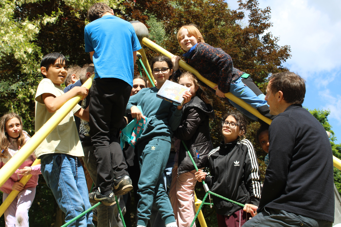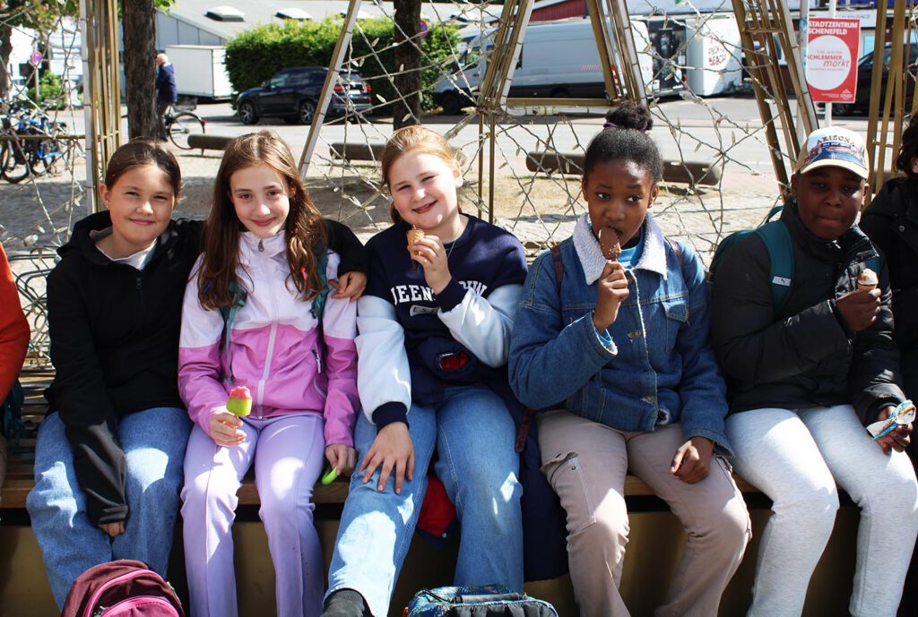 Im Staddi (dem Stadtteilzentrum) erwartete uns schon die Buchhandlung Heymann und die noch für den Publikumsverkehr geschlossenen Türen öffneten sich nur für uns! Es fühlte sich an, wie auf dem roten Teppich zu sein. Dann bekamen wir auch noch einen riesiges Kompliment der Buchhändlerin. Noch nie hatte eine Klasse die Bücherrallye wie wir absolviert. Und wir waren auch noch Patinnen und Paten für die Klasse 5e. Jede(r) von uns nahm ihnen ein Buchgeschenk mit. Dafür gab es im Anschluss auch Eis im Sonnenschein und durch ein kleines Naturschutzgebiet ging es auf zu einem wunderschönen Spielplatz, auf dem wir viel Freude hatten.