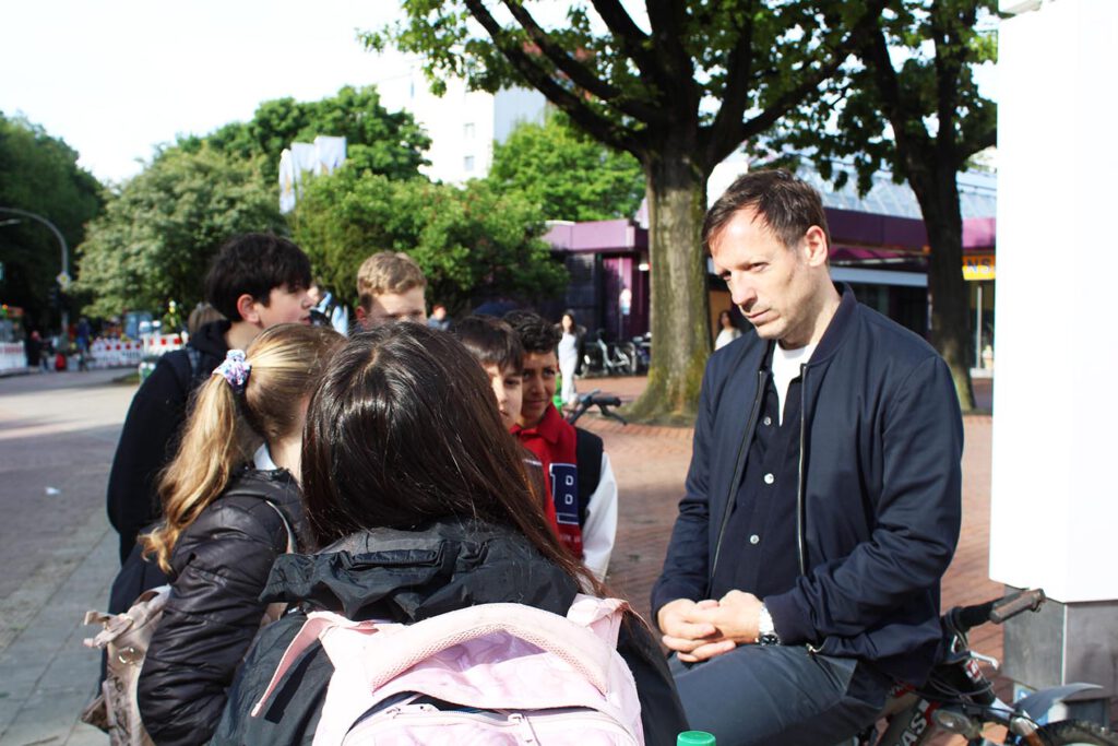 Warten auf den berüchtigten 184-er Bus nach SchenefeldBegrüßung in der Buchhandlung vor Öffnung- ganz exklusiv für unsBei der Rallye zählte Wissen wie SchnelligkeitÜberreichung des Buchpreisgewinnes an das KlassenprecherteamLike Ice in der schleswig-holsteiner Sonne vor dem Staddi