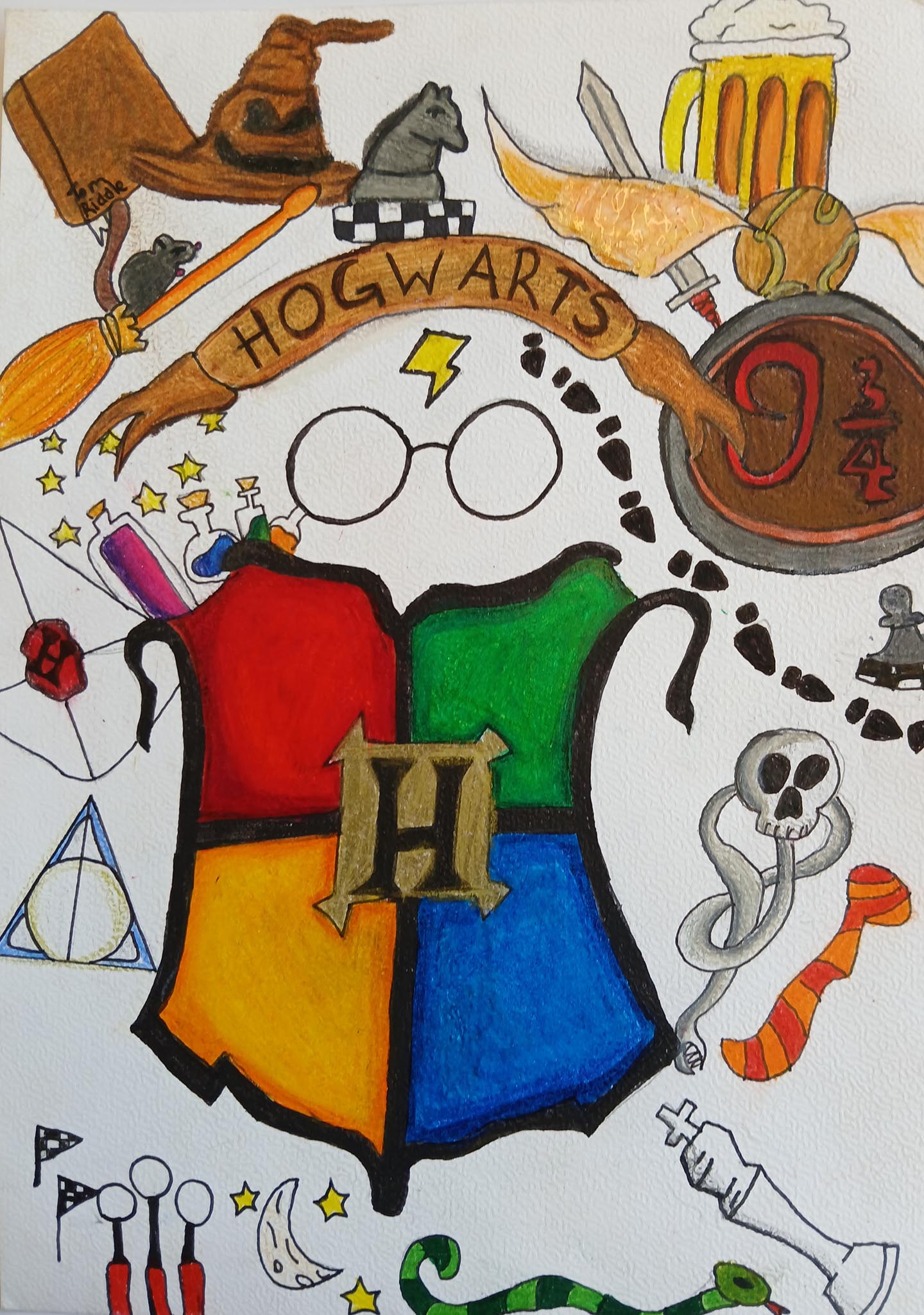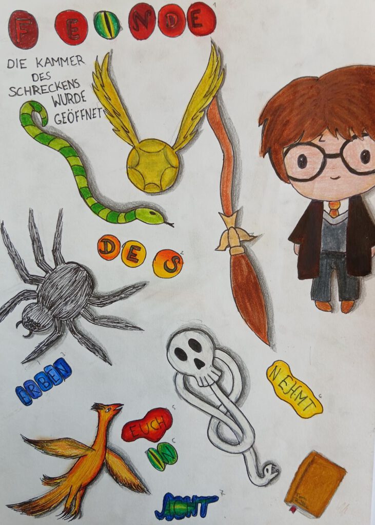 Vom 19. Juni bis zum 08. Juli 2025gibt es im Eingangsbereich des Fachtrakts zur Kunst die diesjährige Abschlußausstellung des Differenzierungs-Kurses “Buch-Kunst-Werkstatt” zu sehen. Im zurückliegenden Halbjahr entstanden wieder vielfältigste Illustrationen. Im Fokus standen u. a. der ,,Herr der Diebe” von Cornelia Funke, die Fantasy-Trilogie ,,Die Chroniken von Lunis – Wächterin des Lichts” der Autorin Janelle Mc Curdy” sowie die Buchreihe ,,Die Duftapotheke – Das Vermächtnis der Villa Evie” der Autorin Anna Ruhe. Die vielen weiteren wunderbaren Bilder entdeckt ihr am besten selber! Auch die unverwüstlichen Harry Potter Fans werden diesmal auf ihre Kosten kommen. Wer noch auf der Suche nach der passenden Lektüre für die Sommerferien ist, kann sich hier inspirieren lassen! Herzlichst, Eure Frau Möbius (Abbildungen: ,,Magische Gegenstände” ,,Harry Potter – Der Stein der Weisen” (Zeichnung von Narin, 6E), ,,Harry Potter – Die Kammer des Schreckens (Zeichnung von Leonie, 6E), ,,Die Chroniken von Lunis – Wächterin des Lichts” (Zeichnung von Rose, 6E)