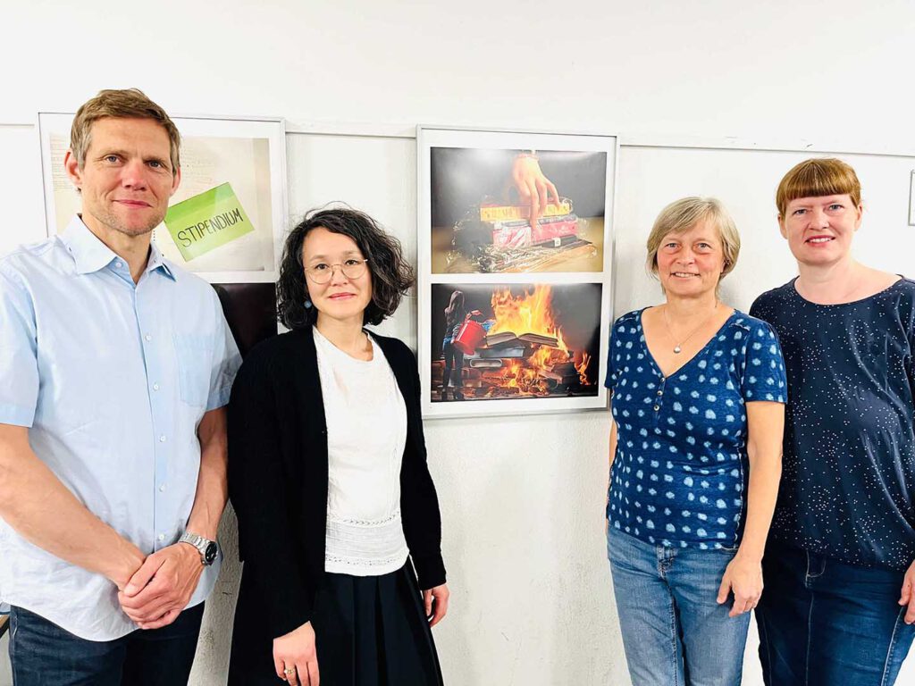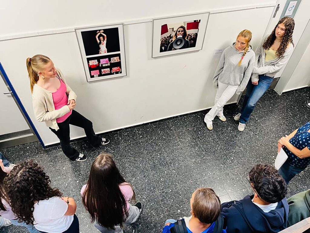 Recht auf Bildung (Izabella, Ines, Monika und Anne-Charlene)Feminismus (Alina, Johanna und Hannah)Friedensvisionen (Mustabser, Maksym, Tim, Maxim und Umut)Frank Scherler (Schulleitung), Mikiko Fenner (Projektleitung, Akademie für Fotografie), Valérie Wagner (Projektbegleitung) und Silvia Götz (Kulturbeauftragte)